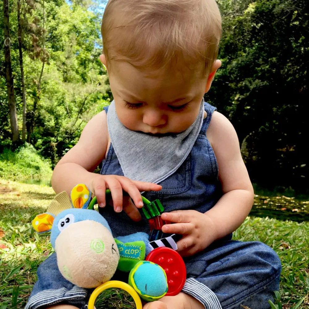 En flott aktivitetsleke med ulike teksturer og materialer som både underholder og stimulerer babyen. Med denne leken kan babyen både kjenne, utforske og riste, og det er en flott måte å oppmuntre til lek og læring på.