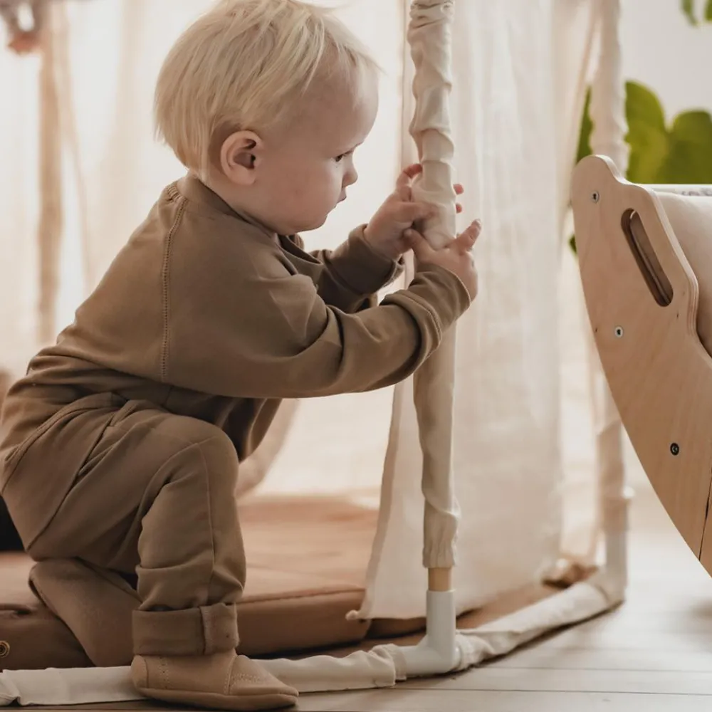 Aldri mer tapte sko. Med babysko fra Petit La Busch er du sikret at begge sko alltid blir med hjem igjen. Bruk de i babystolen, eller i din vognpose, eller til bruk inne i huset. Barn har behov for å kunne sanse og oppleve omgivelsene sine, og det gir disse fine babyskoene dem muligheten til. Det tynne 2-3 mm laget med semsket skinn, samt et fotformet design uten stiv og tykk gummisåle, gir mulighet for at langt flere sanseinntrykk kan oppfattes gjennom barnets føtter.