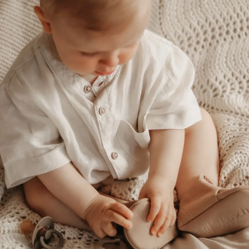 Petit La Busch babysko er en vakker kombinasjon av godt håndverk og vakre detaljer, samlet i ett og samme produkt. Skoene / tøflene er kun 2-3mm tykke, og er laget av semsket skinn og utformingen av føttene, uten noen stiv og tykk gummisåle. Det gjør at langt flere sanser kan plukkes opp gjennom barnets føtter.