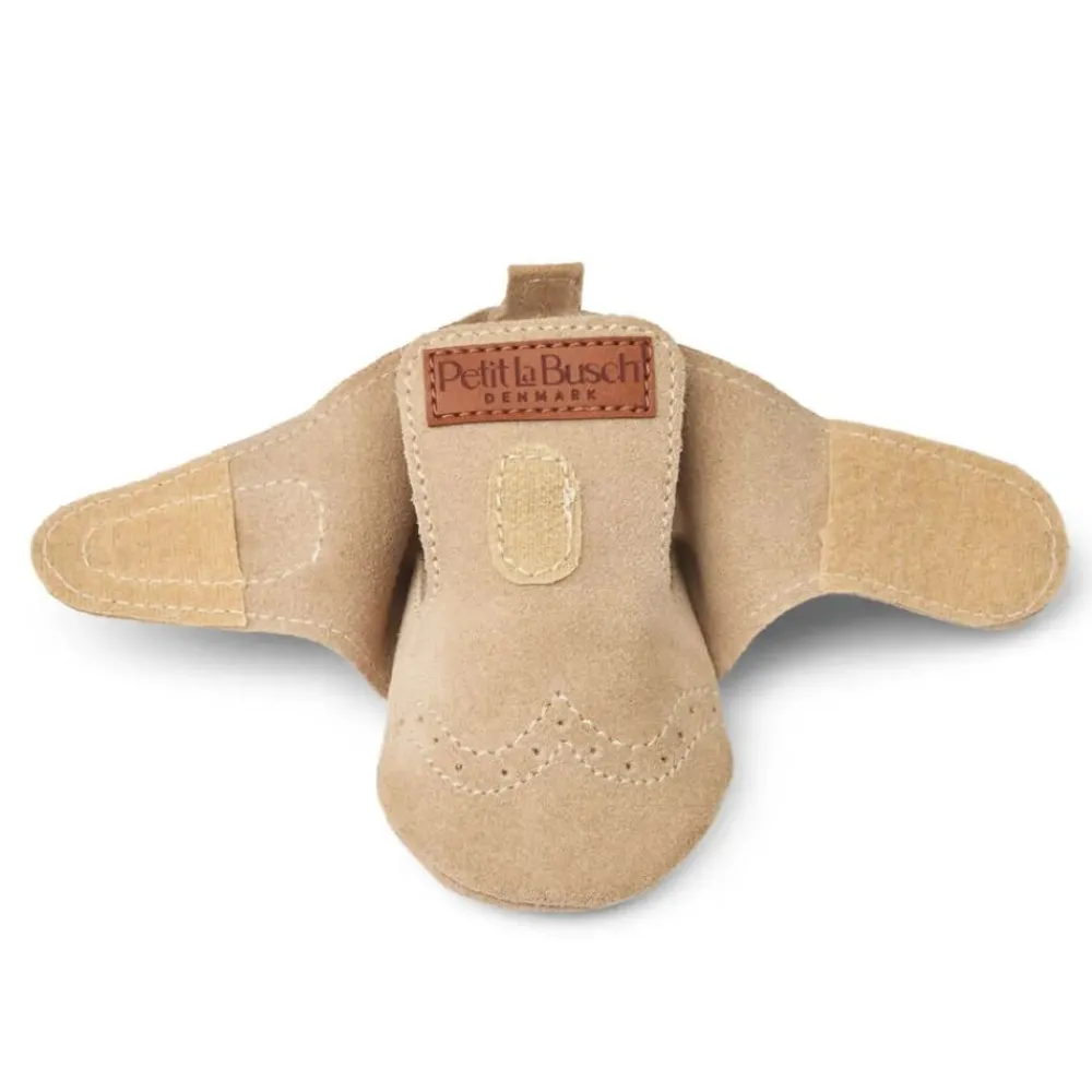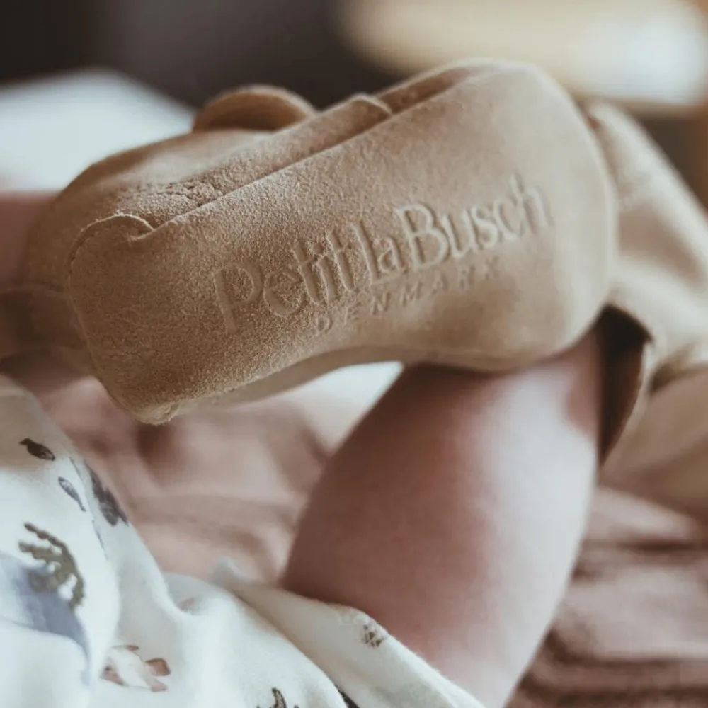 Petit La Busch babysko er en vakker kombinasjon av godt håndverk og vakre detaljer, samlet i ett og samme produkt. Skoene / tøflene er kun 2-3mm tykke, og er laget av semsket skinn og utformingen av føttene, uten noen stiv og tykk gummisåle. Det gjør at langt flere sanser kan plukkes opp gjennom barnets føtter.