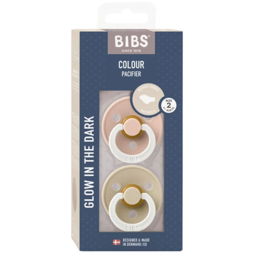 Søte anatomiske BIBS smokker produsert av naturgummilatex, som lyser i mørket. Brystvorten er utstyrt med en ventil som slipper ut luft når babyen lukker seg på brystvorten og dermed flater ut brystvorten til å forme seg naturlig etter babyens munnhule. Det runde lettvektsskjoldet vender bort fra den sensitive og sarte huden rundt babyens munn for å sikre minimal kontakt med babyens nese og munn, noe som betyr mindre sjanse for fuktighetsoppbygging fra spytt som kan forårsake utslett og såre flekker.