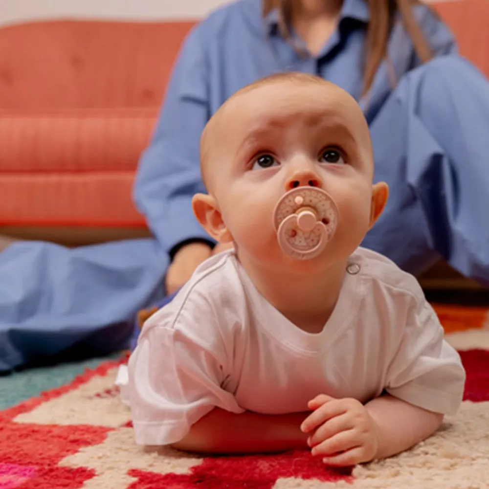 Søte anatomiske BIBS smokker produsert av naturgummilatex, som lyser i mørket. Brystvorten er utstyrt med en ventil som slipper ut luft når babyen lukker seg på brystvorten og dermed flater ut brystvorten til å forme seg naturlig etter babyens munnhule. Det runde lettvektsskjoldet vender bort fra den sensitive og sarte huden rundt babyens munn for å sikre minimal kontakt med babyens nese og munn, noe som betyr mindre sjanse for fuktighetsoppbygging fra spytt som kan forårsake utslett og såre flekker.