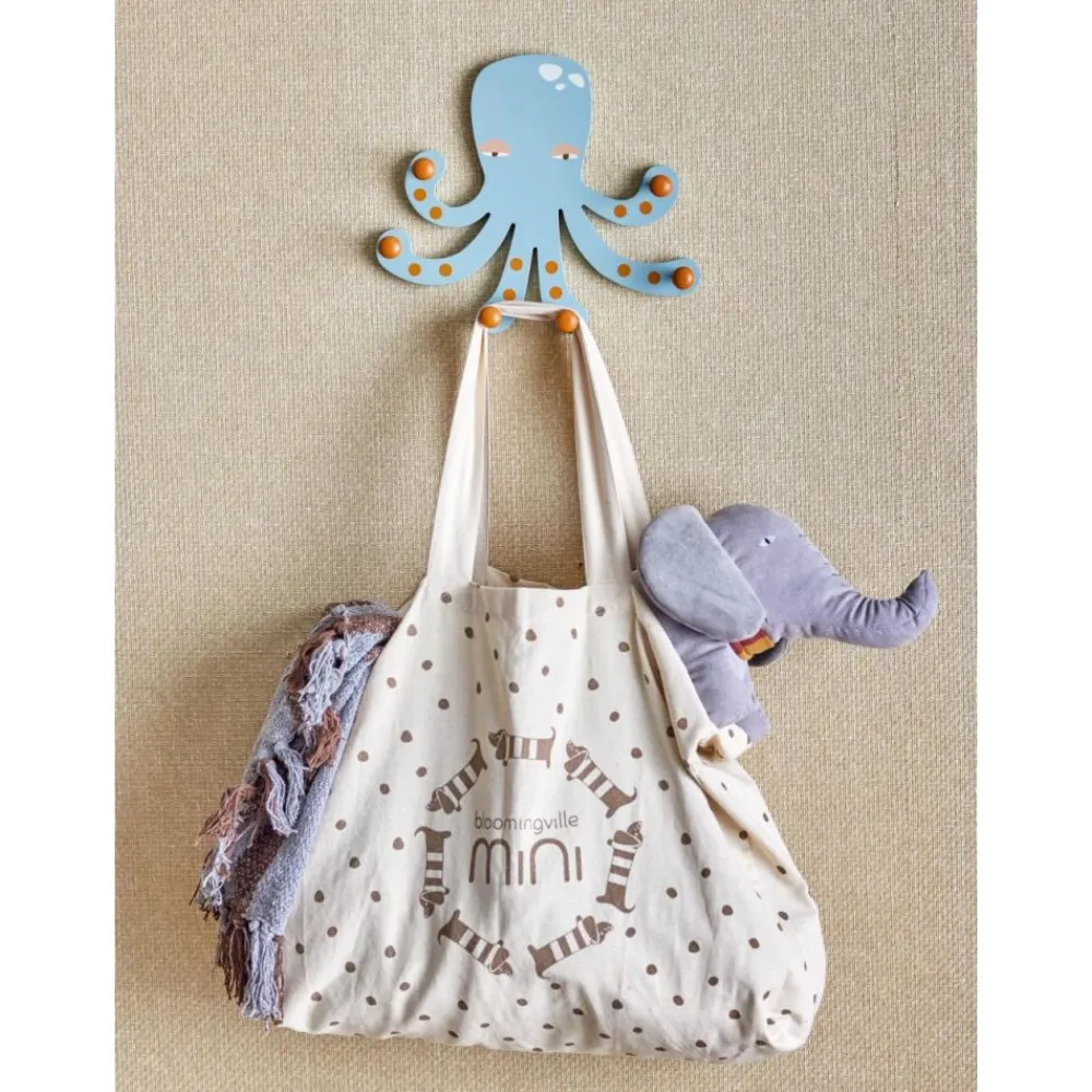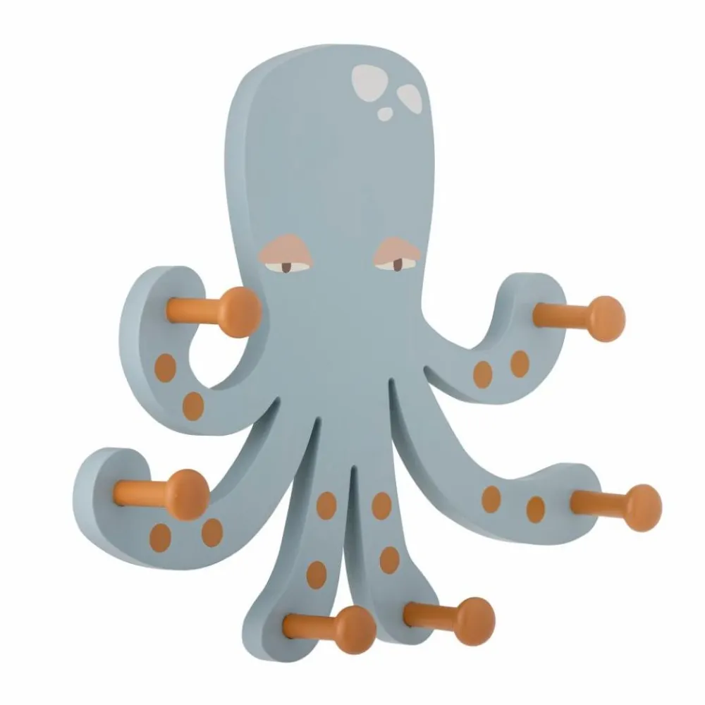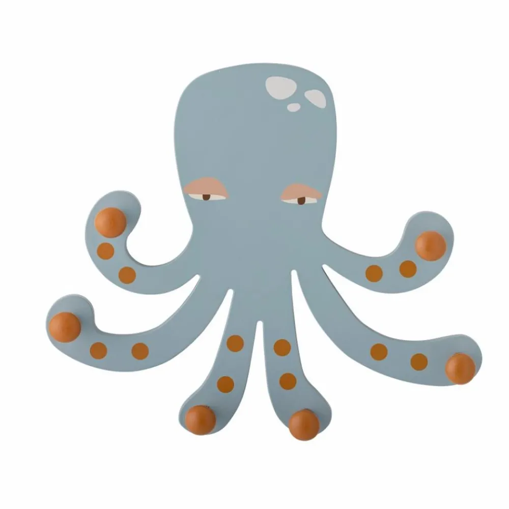 Oswall Knaggrekke fra Bloomingville MINI er en sjarmerende blekksprut som bringer både moro og orden på barnerommet. Med sin støvete blå farge og rødlige nyanser på krokene skaper den en koselig atmosfære og fanger barnets oppmerksomhet. De seks armene, hver med en solid krok, holder enkelt yttertøy, vesker og utkledningsklær.