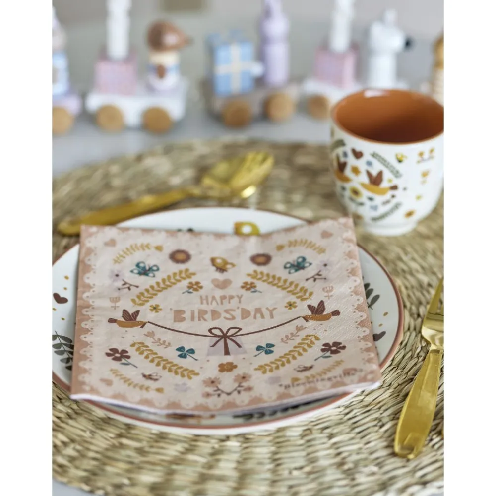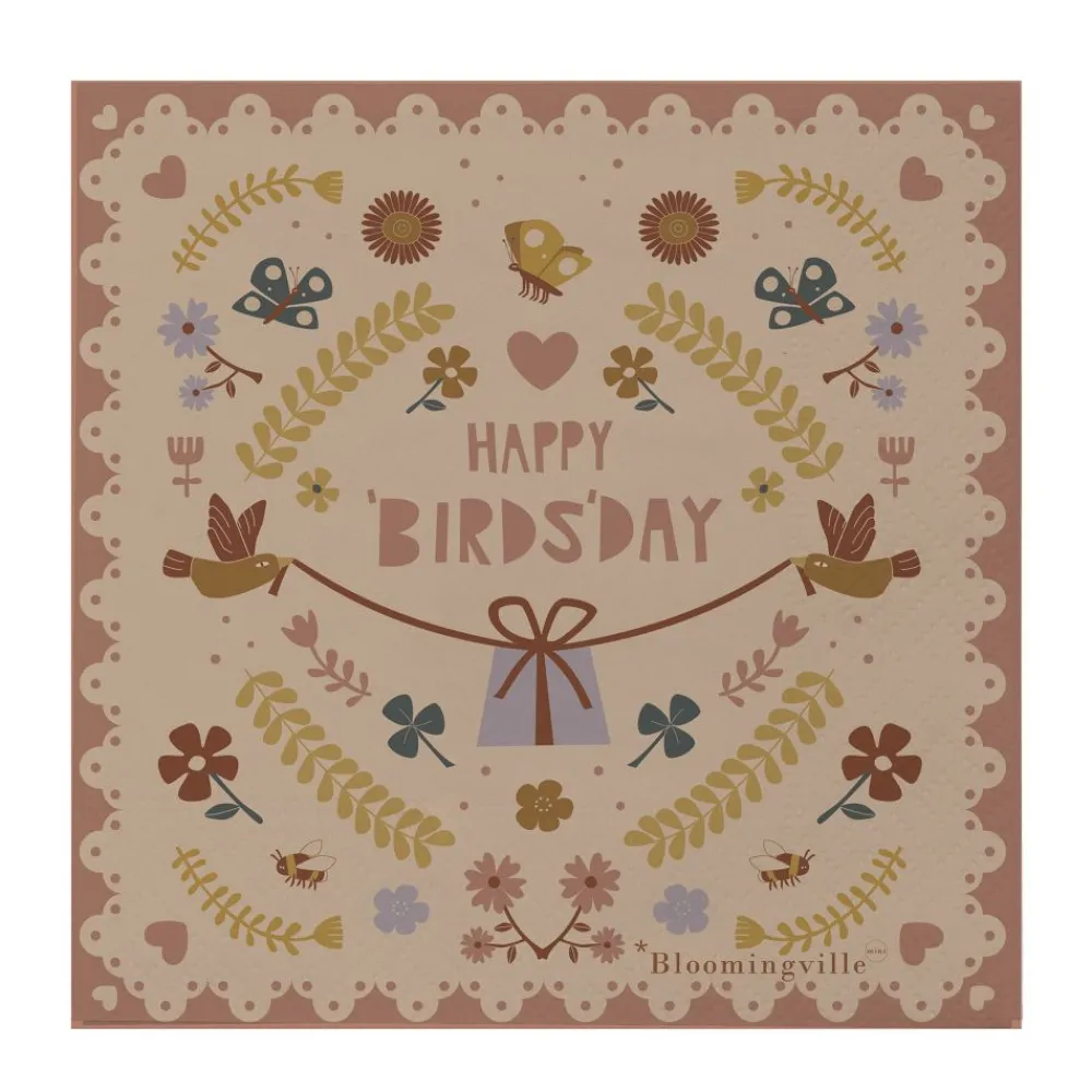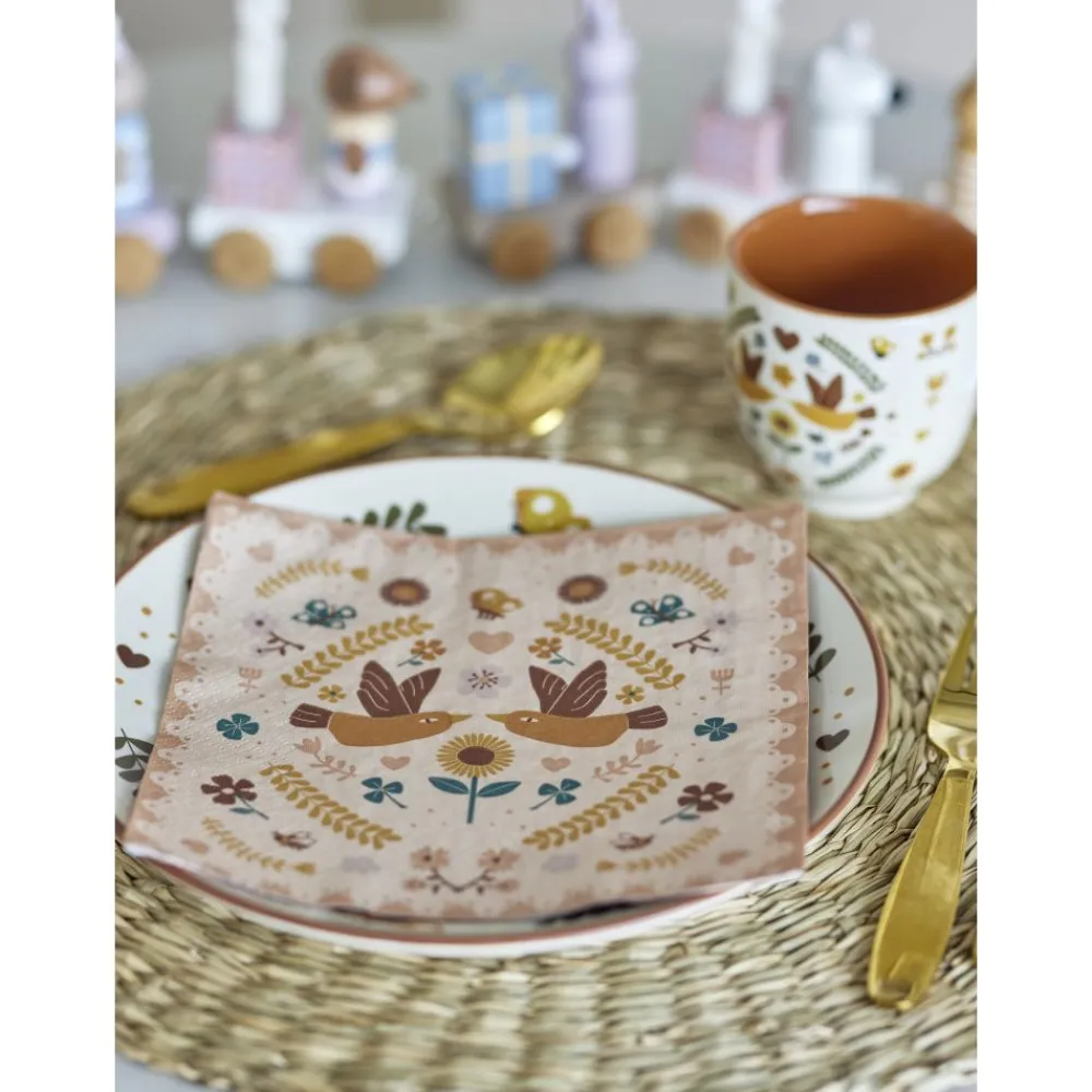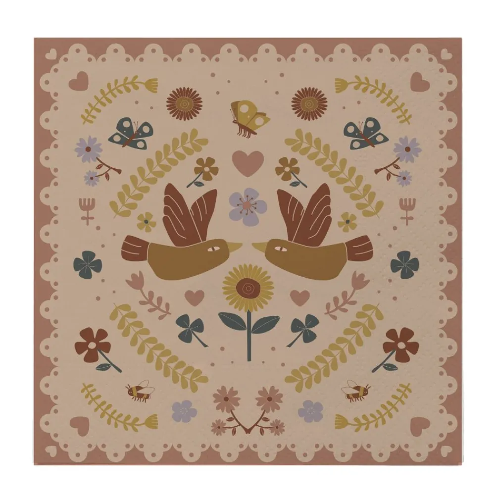 Bryn serviett fra Bloomingville MINI har en søt og lunefull design med blomster, hjerter og fugler. Disse serviettene er perfekte for å sette et lekent preg på enhver borddekking, og skaper en munter atmosfære for både spesielle anledninger og hverdagslige måltider. Vend servietten for å oppdage et herlig nytt mønster på den andre siden. Hver pakke inneholder 20 servietter, laget av en FSC-sertifisert blanding.
