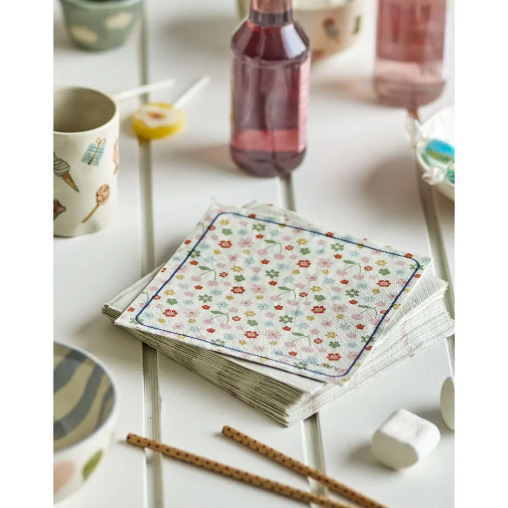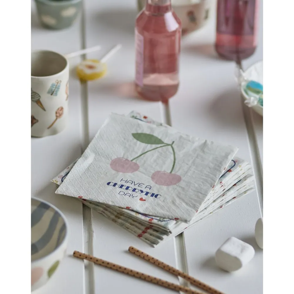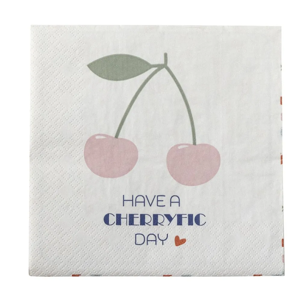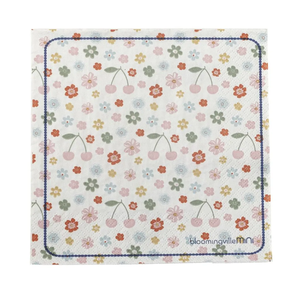 Kirsebærservietten fra Bloomingville MINI har et nydelig og fargerikt mønster med blomster og kirsebær, som gir en munter touch til enhver borddekking. Vend servietten og oppdag et sjarmerende nytt design på den andre siden. Hver pakke inneholder 20 servietter, laget av en FSC-sertifisert blanding.
