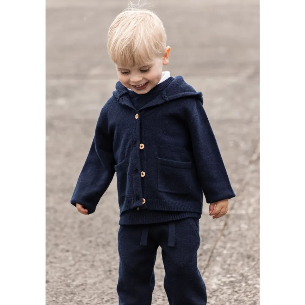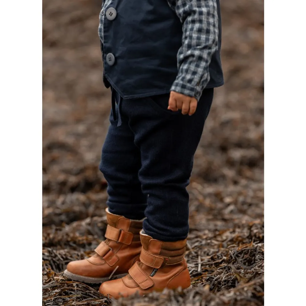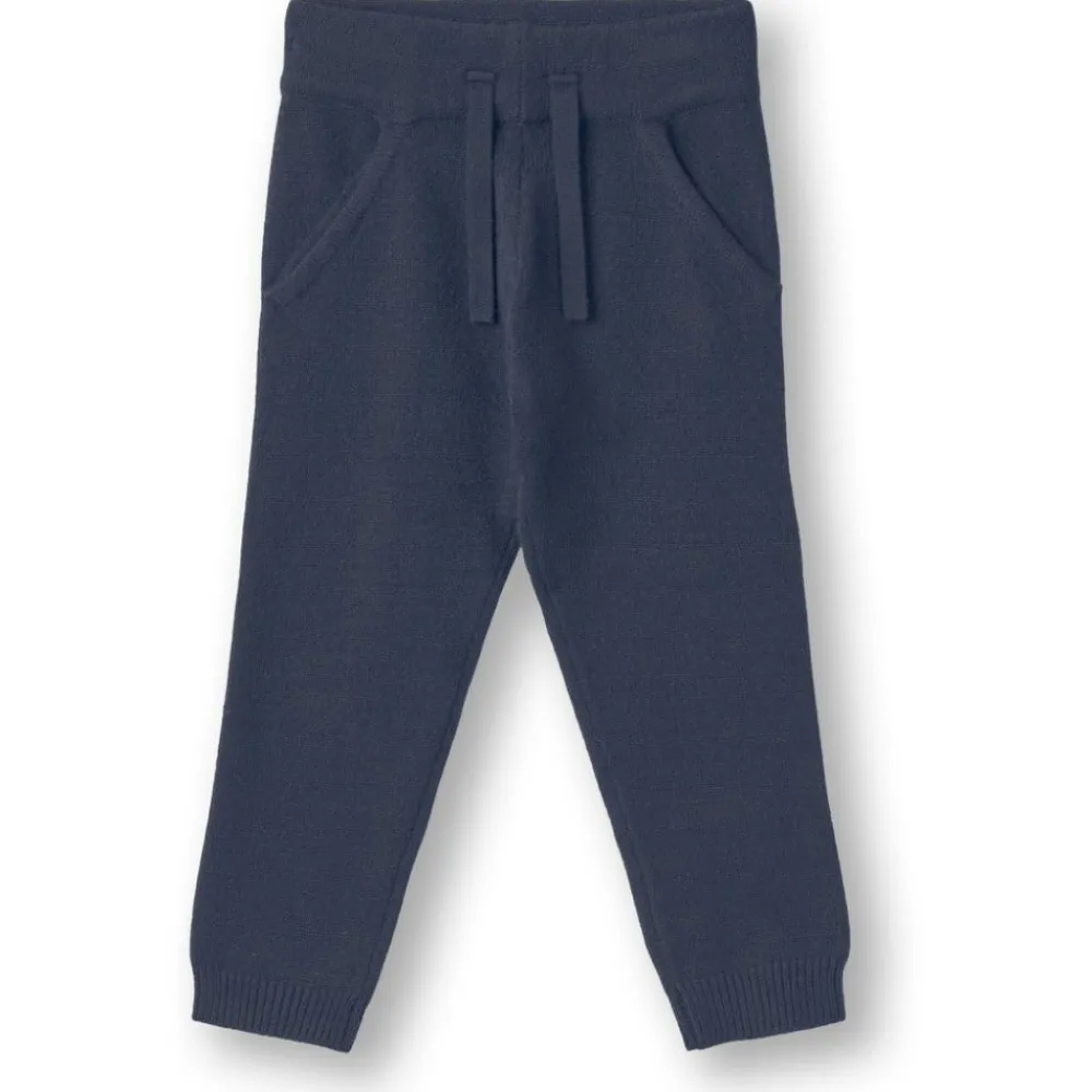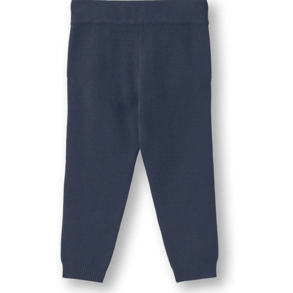 Myk og løs strikkebukse med bred elastisk linning. Buksen har dekorative stropper, lommer og ribbestrikket kant ved anklene. Passformen er behagelig og har et tidløst utseende.