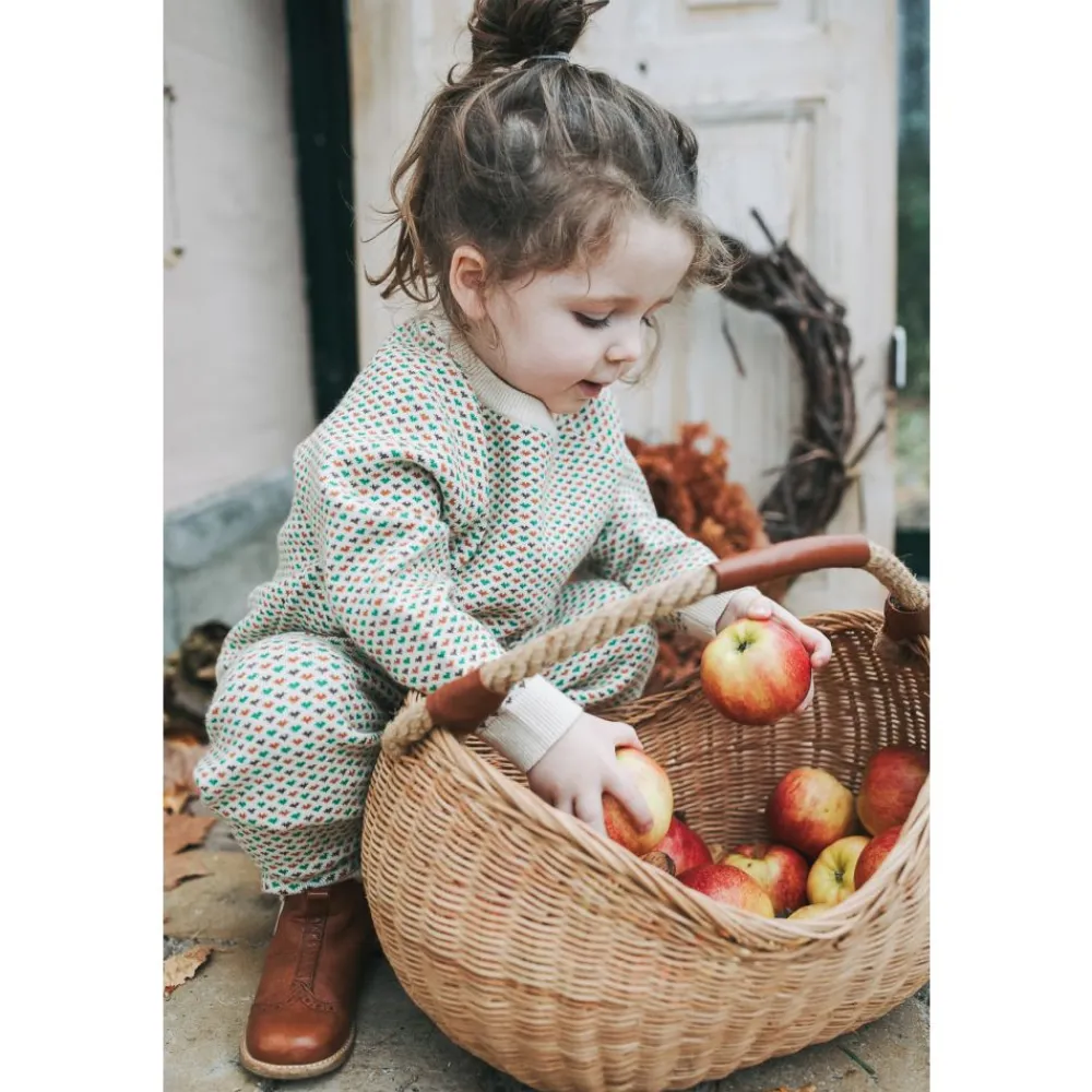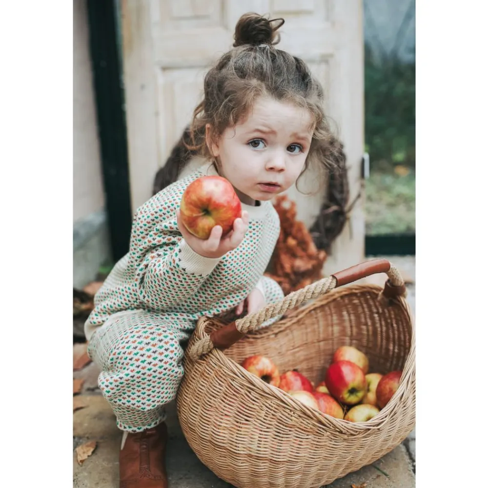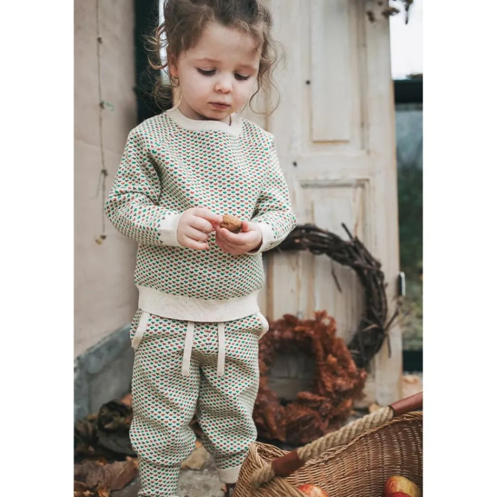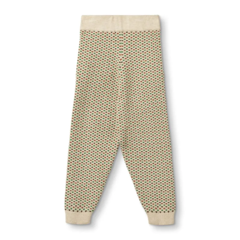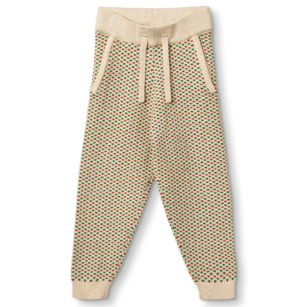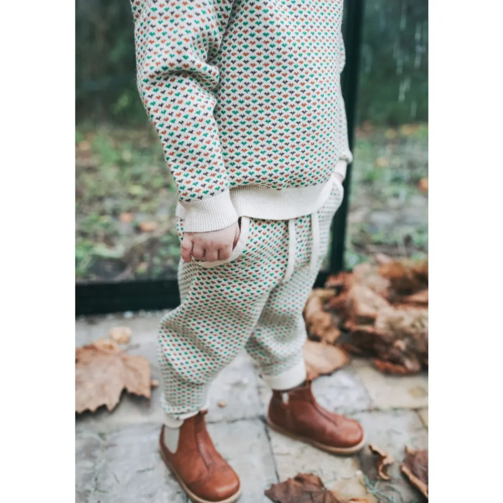 Myk løsstrikket bukse med bred elastisk linning. Buksen har dekorative stropper og lommer, og ribbestrikket mansjett ved anklene. Passformen er behagelig og har en tidløs look med mønster i fire herlige farger i jacquardstrikk.