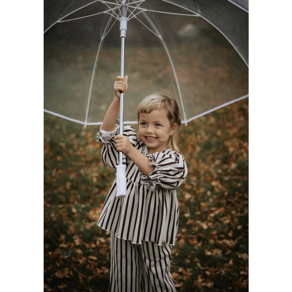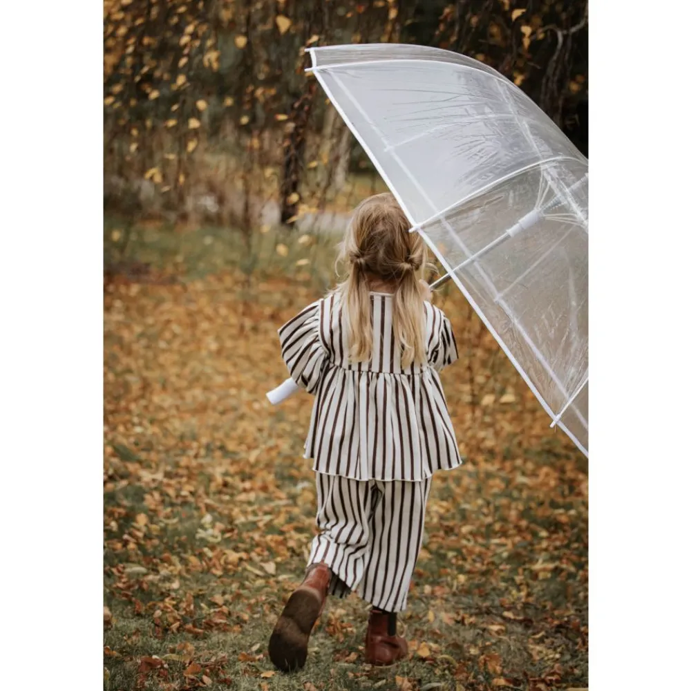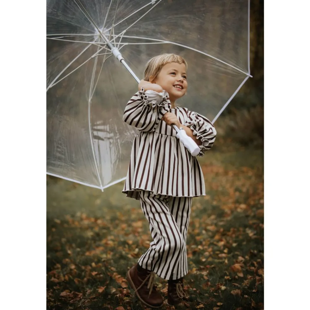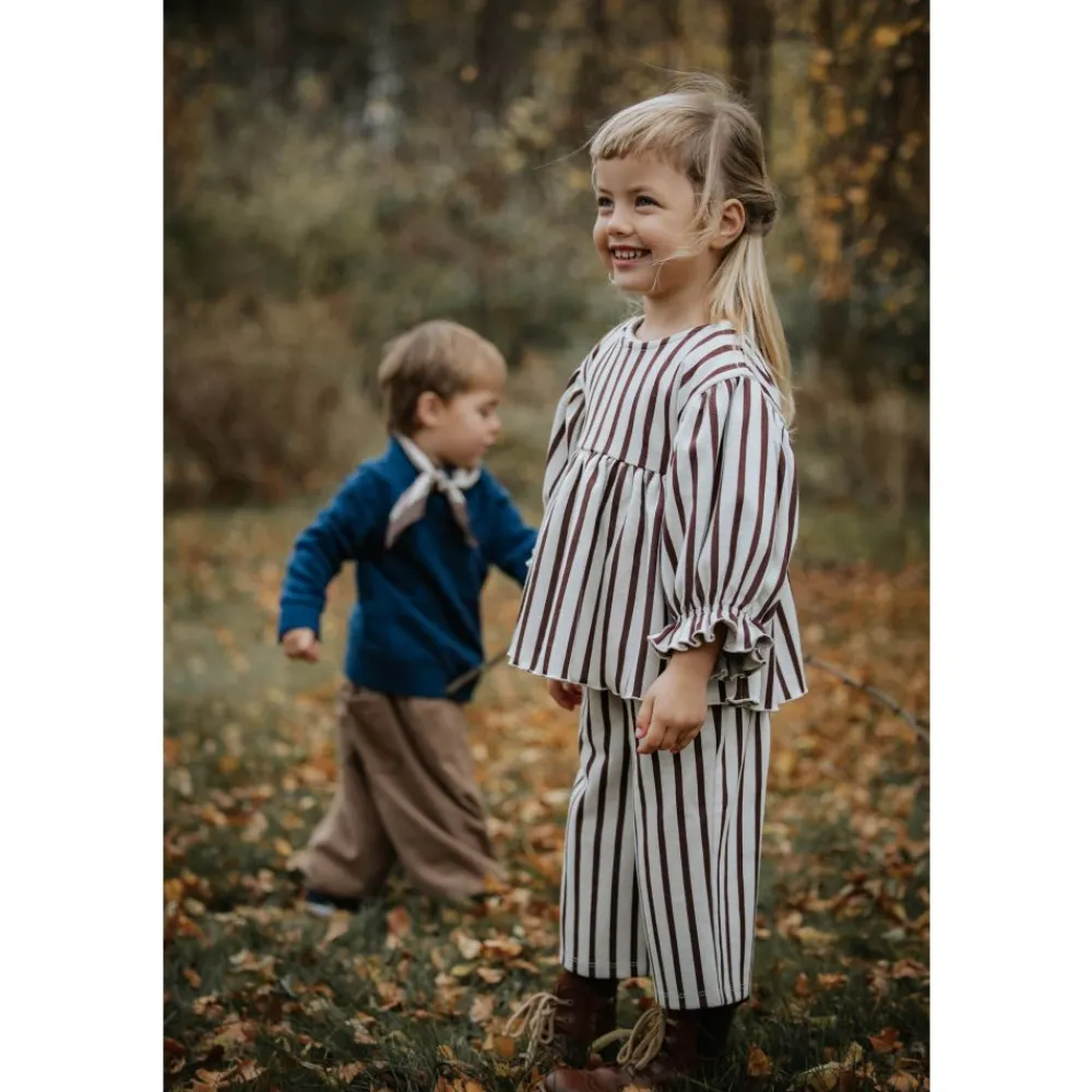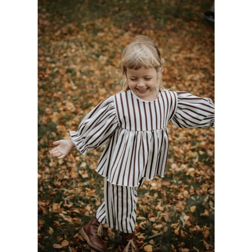 Lang bukse i mykt sweatstoff med striper. Buksen har en løs og komfortabel passform med elastikk i livet og skrålommer i sidene. En liten volang nederst gir et søtt og feminint uttrykk. Lengden går til anklene, noe som gjør den ideell til bruk hele året – også i de kjøligere månedene.
