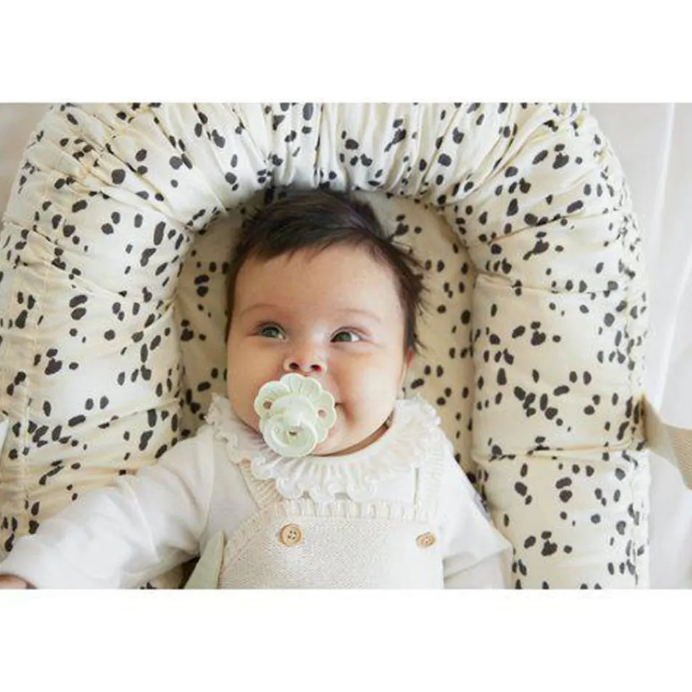 Binky Bloom smokken har en fin blomsterformet skjold med tre ventilasjonshull for å tillate luftsirkulasjon og beskytte den sensitive huden rundt babyens munn mot irritasjon. Smokken passer for babyer fra 3 måneder og oppover.