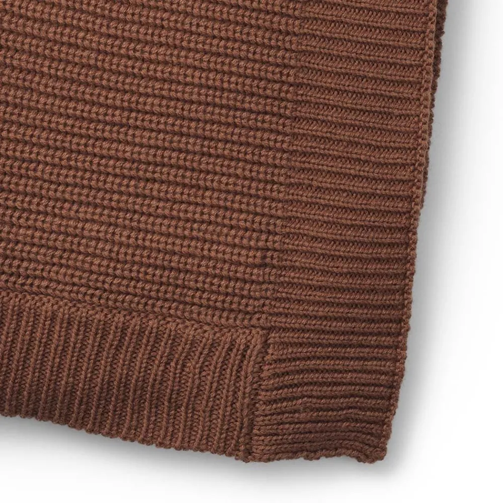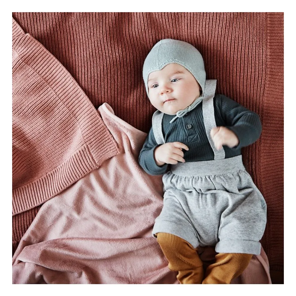 Elodie strikkede ullteppe er en myk blanding av ull og bomull som holder den lille varm selv på de kaldeste vinterdagene. Materialene gjør stoffet pustende og irriterer ikke selv den mest sensitive huden. Teppets størrelse gjør det egnet for alle situasjoner der du trenger varmere beskyttelse for barnet ditt, både hjemme og når du er på farten.