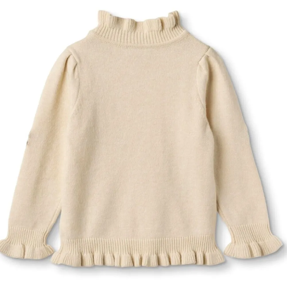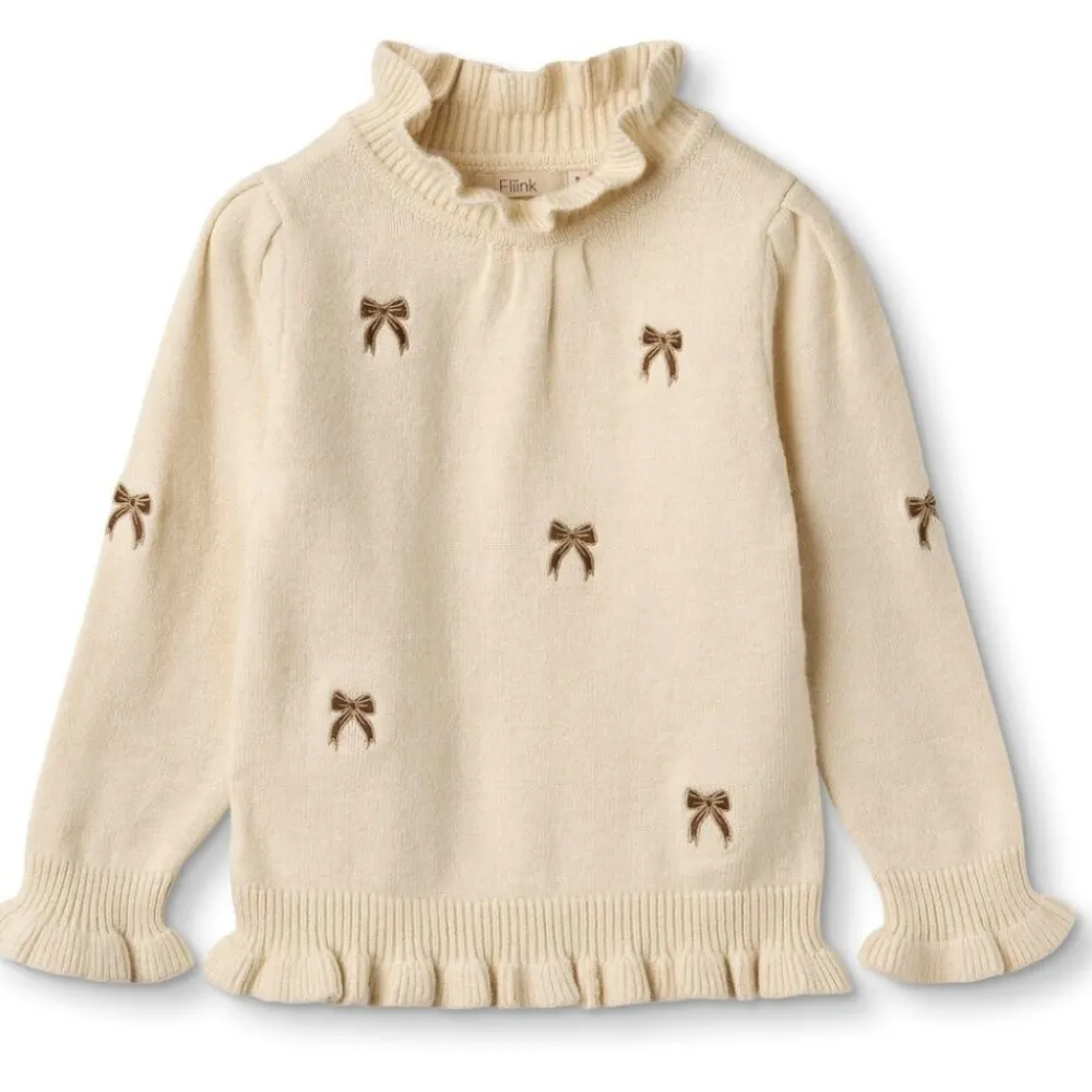 Finstrikket genser med volanger ved ermer, hals og nedrekant som gir den et feminint uttrykk. Genseren er laget i en myk og varm kvalitet som er lett å bevege seg i og kan brukes i flere sesonger. Den har broderi med sløyfer foran og på ermer.