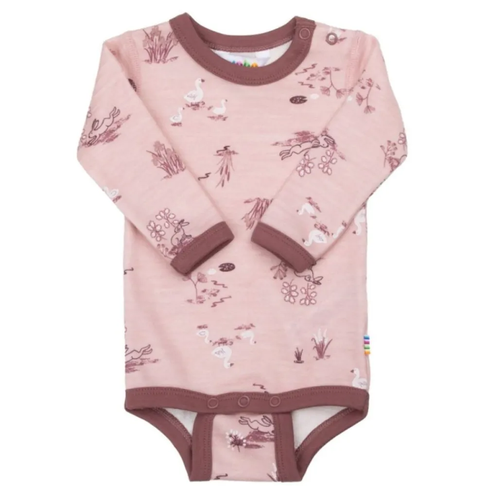 Søt og komfortabel body i myk ull- og bambusblanding. Den praktiske åpningen med trykknapper på den ene skulderen og mellom bena gjør av- og påkledning enkel. Med myk bambusviskose innerst og varmende merinoull ytterst er denne bodyen spesielt godt egnet for barn med sensitiv hud.