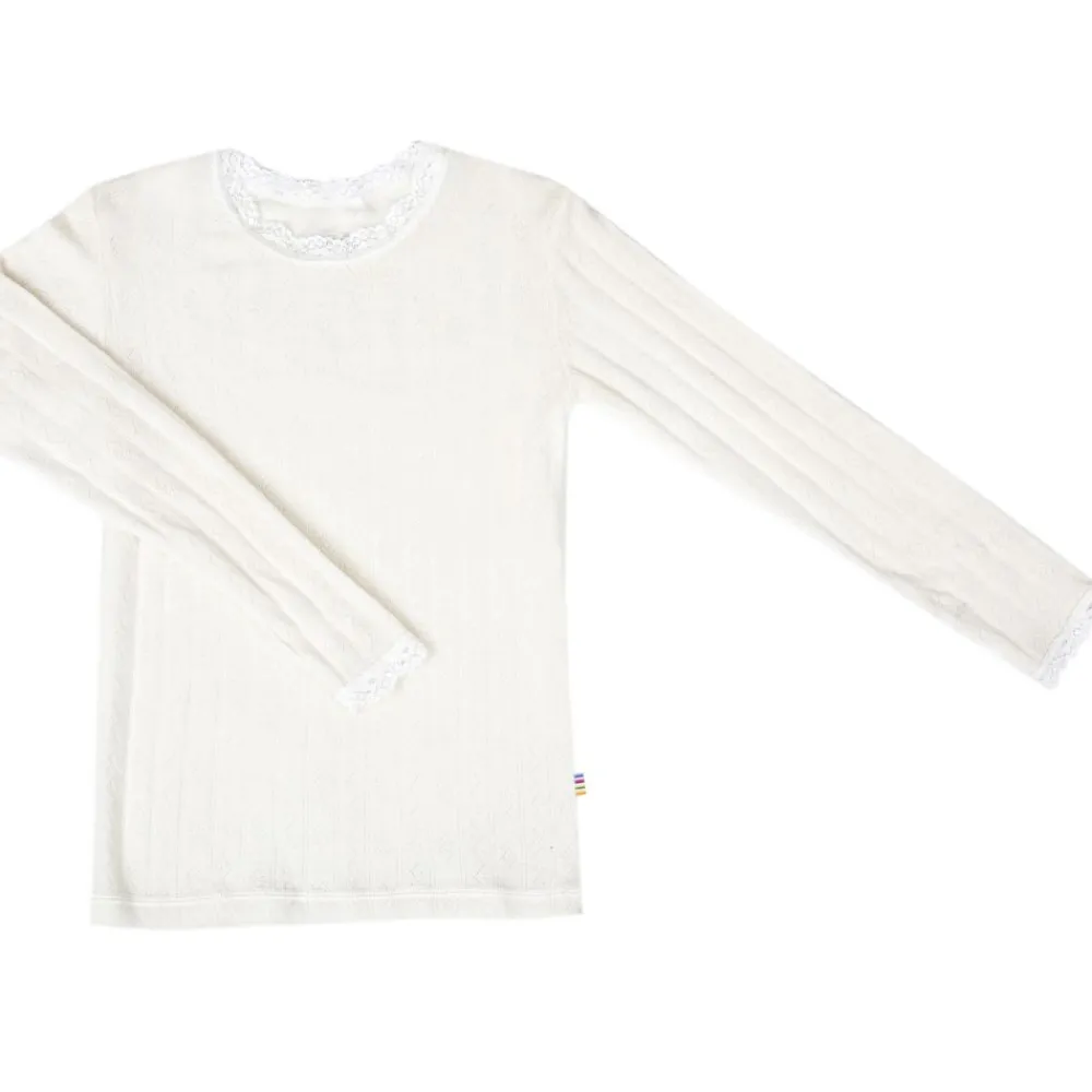 En nydelig genser fra Joha med blonder og hullmønster som gir en ekstra touch av søthet til designet. Ull og silke er naturlige materialer som er skånsomme mot barnets sensitive hud. Ullens regulerende egenskaper gjør at den varmer når det er kaldt og svaler når det er varmt. Fin å bruke hele året.