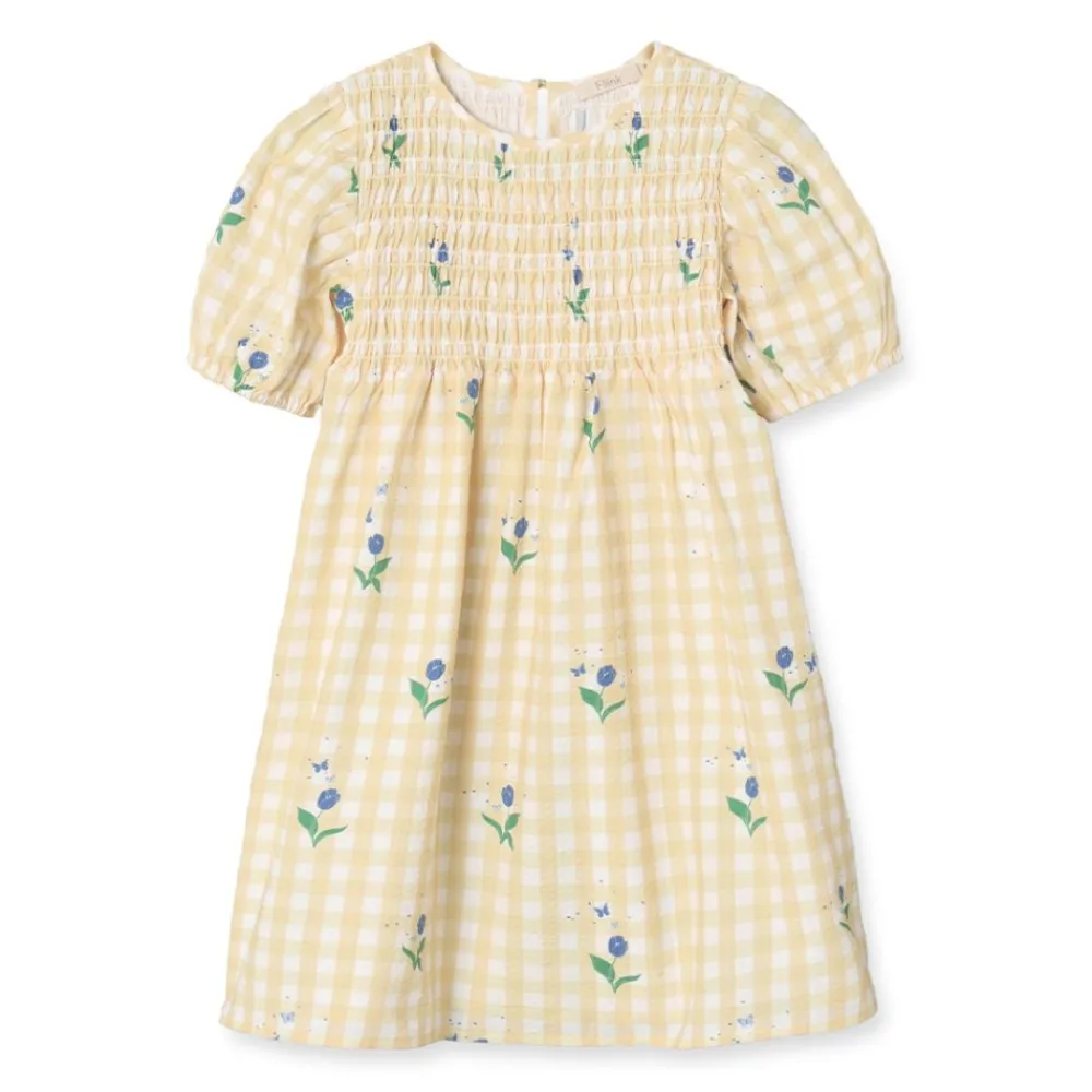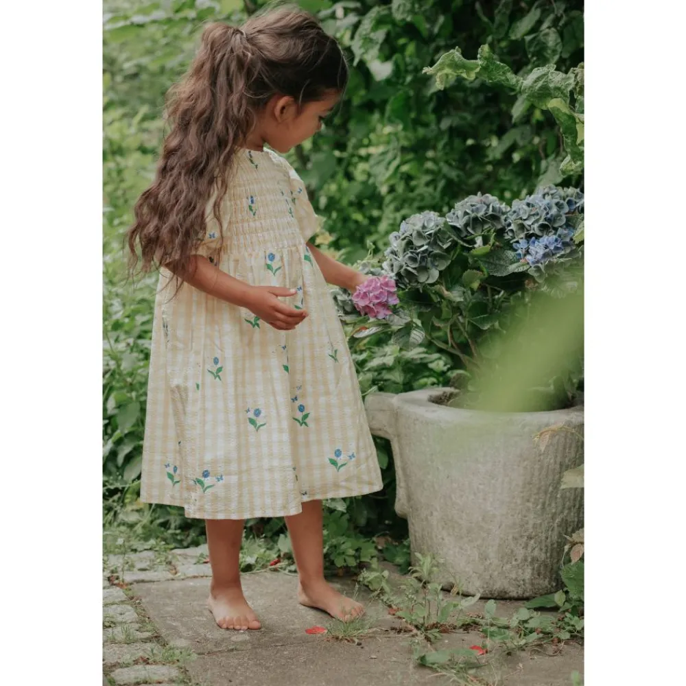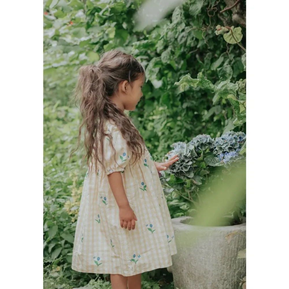 Få en frisk og sommerlig stil med denne nydelige bomullskjolen. Det sjarmerende rutemønsteret i myke gultoner kombineres med delikate blomsterdetaljer, noe som gir et romantisk preg. Den behagelige passformen, med lett rynket overdel og korte puffermer, gjør kjolen både luftig og komfortabel. Perfekt for varme dager og små eventyr, samtidig som den er enkel å style med sandaler eller lette joggesko for en gjennomført look.