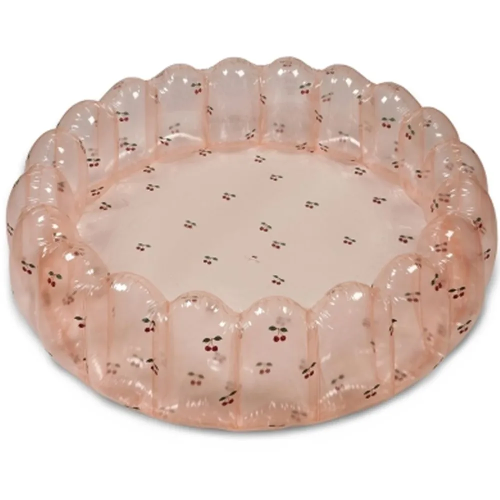 Stort oppblåsbart basseng med kamskjellkanter, laget av slitesterk PVC. Fint å ta med seg på tur i sommervarmen eller blåse opp i hagen.
