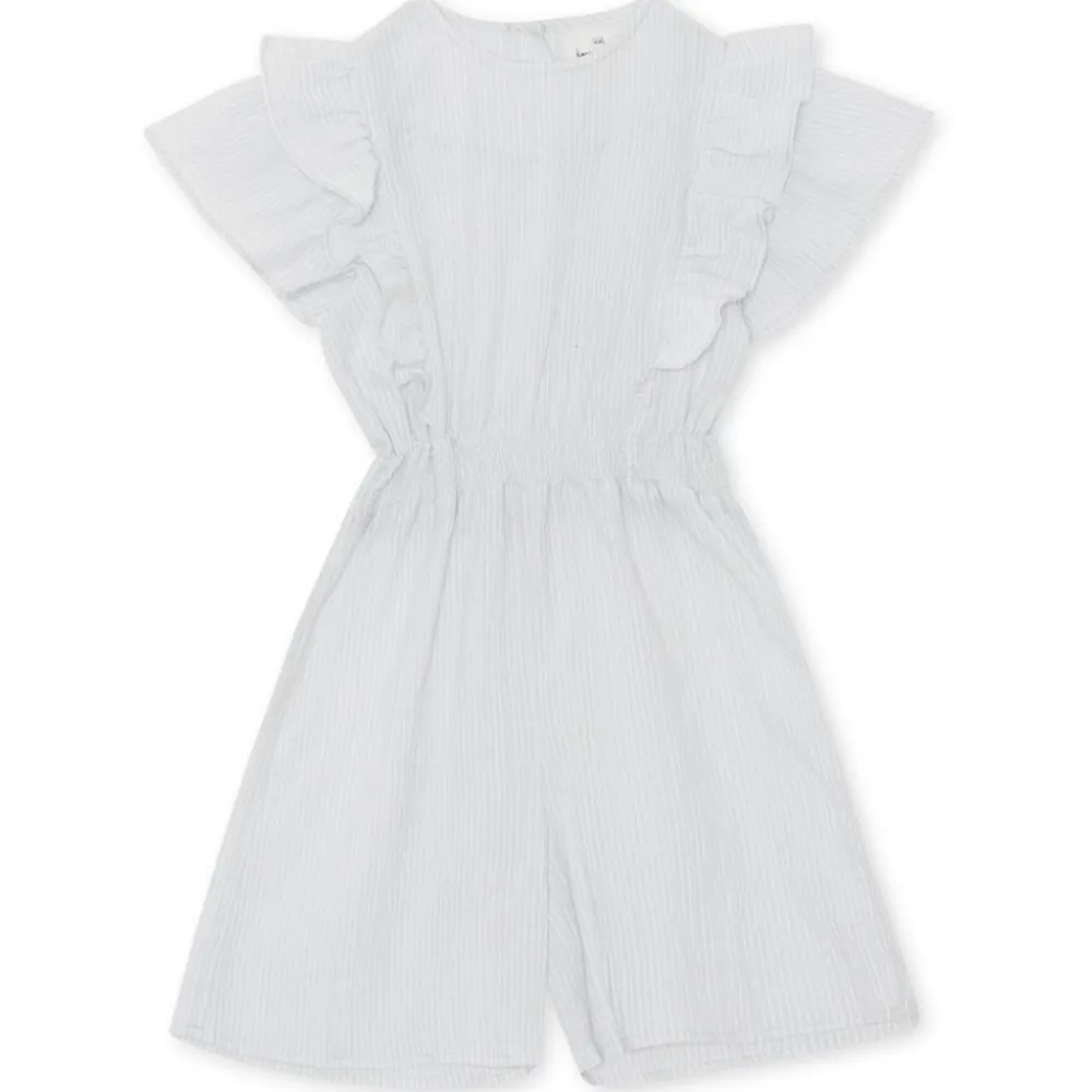 Lett og luftig jumpsuit laget i 100 prosent bomull. Designet med elastisk midje og korte vide ermer med volangdetaljer. Lukkes med perlemorknapper bak.