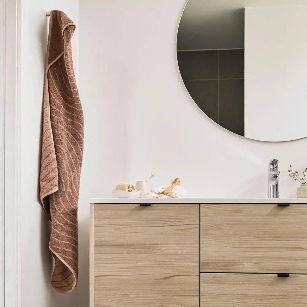 Badehåndklet er laget med et unikt, lekent og håndtegnet tekstildesign. Woodland-universet er designet i samarbeid med tekstildesigner Sine Mendgaard-Johannsen. Stripene fører til eventyrlige herligheter: skjulte stier, fortryllede dyr eller skjulte huler hvor eventyr venter på å bli utforsket.