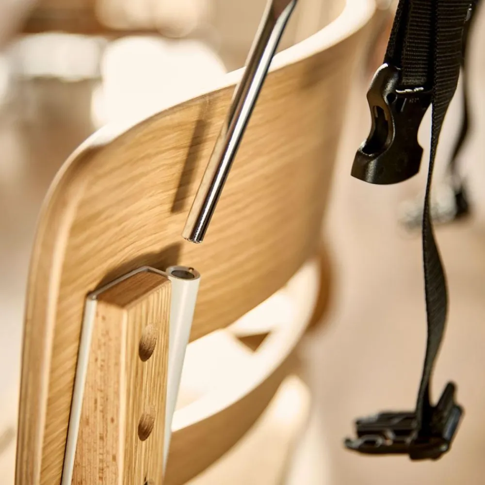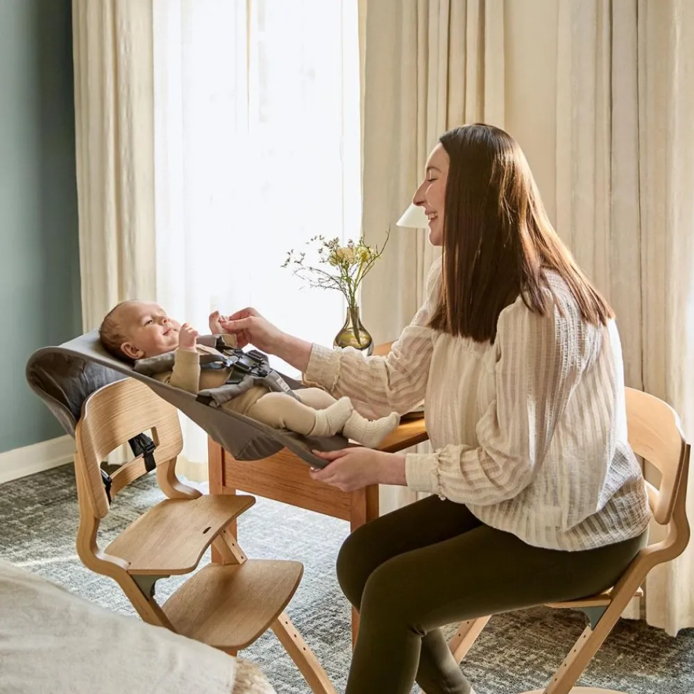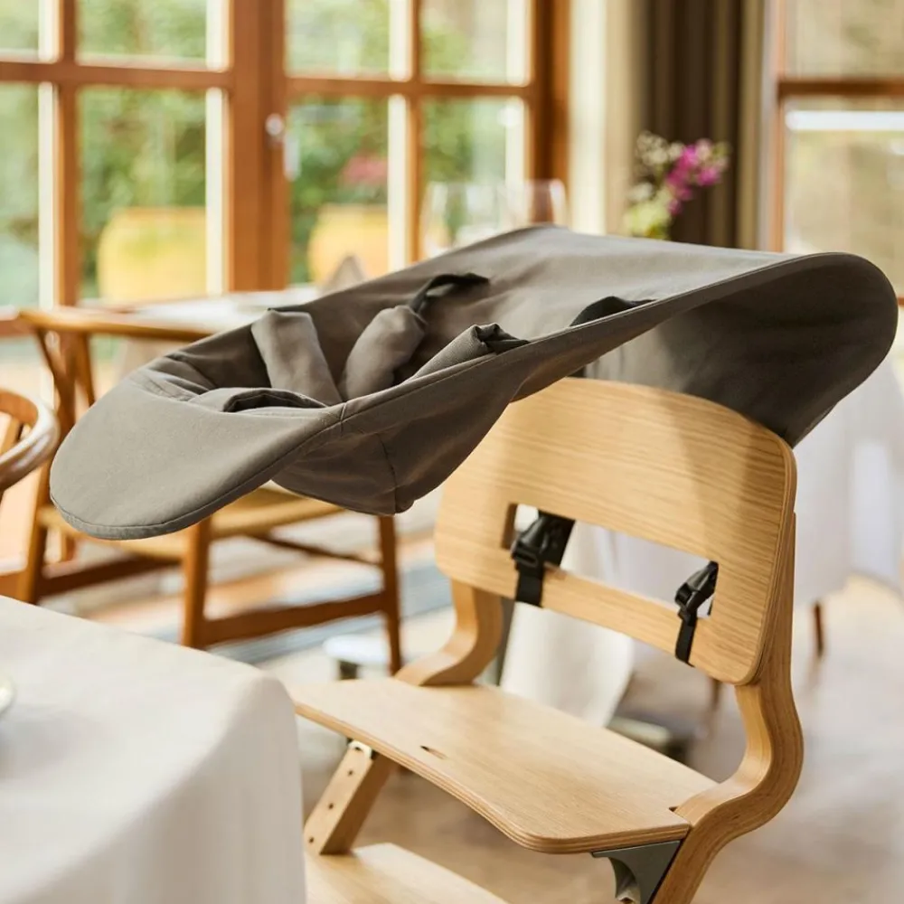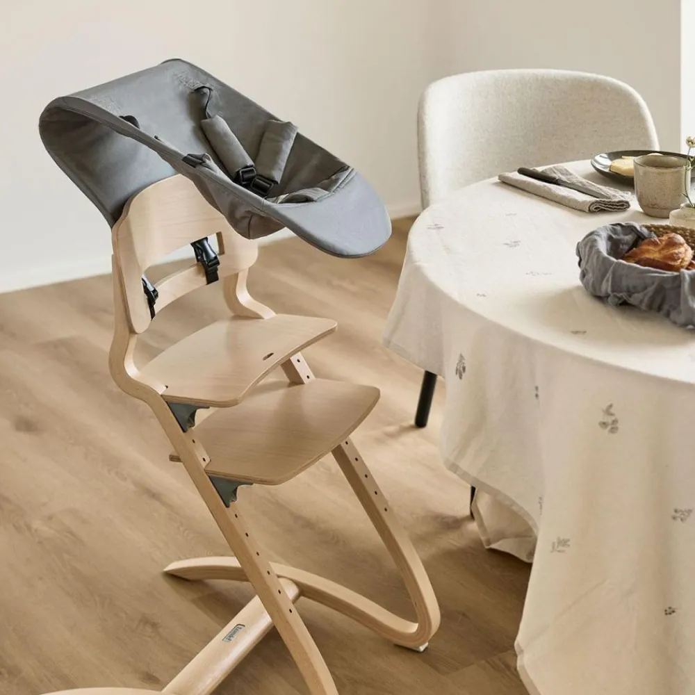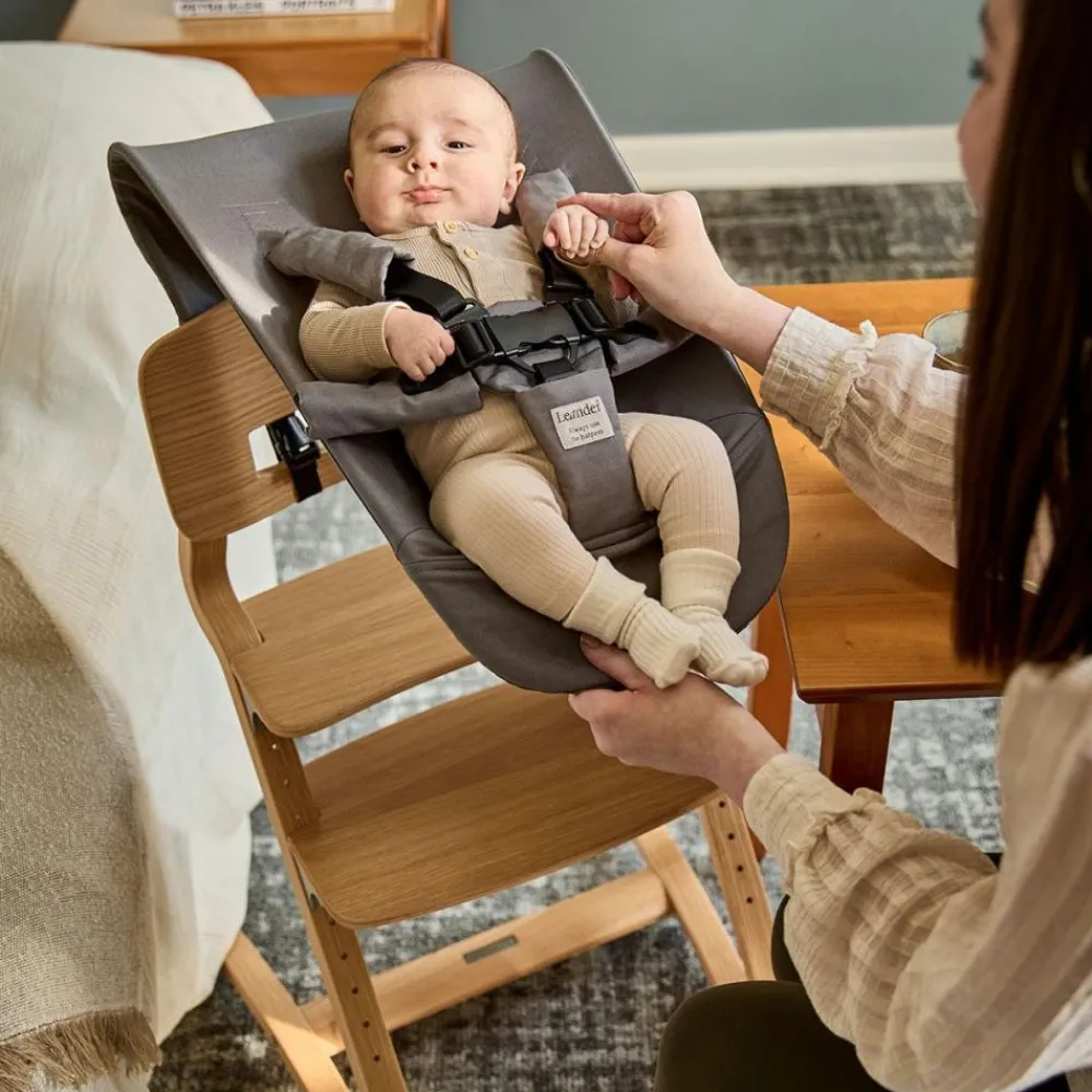 Med Leander Nyfødt-sete kan selv de minste være en del av de viktige familiestundene rundt middagsbordet. Setet er laget for spedbarn fra 0–6 måneder (opptil 9 kg) og gir både trygghet og komfort med sin ergonomiske utforming og 5-punkts sikkerhetssele. Trekket er sydd i 100 % økologisk bomullskanvas, og den lette konstruksjonen følger barnets naturlige bevegelser. Når setet ikke er i bruk, foldes det enkelt sammen og oppbevares i en skuff eller et skap.