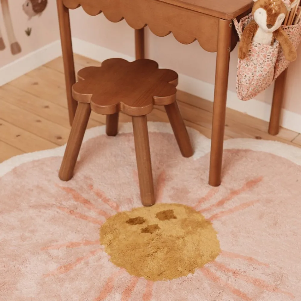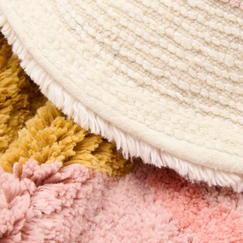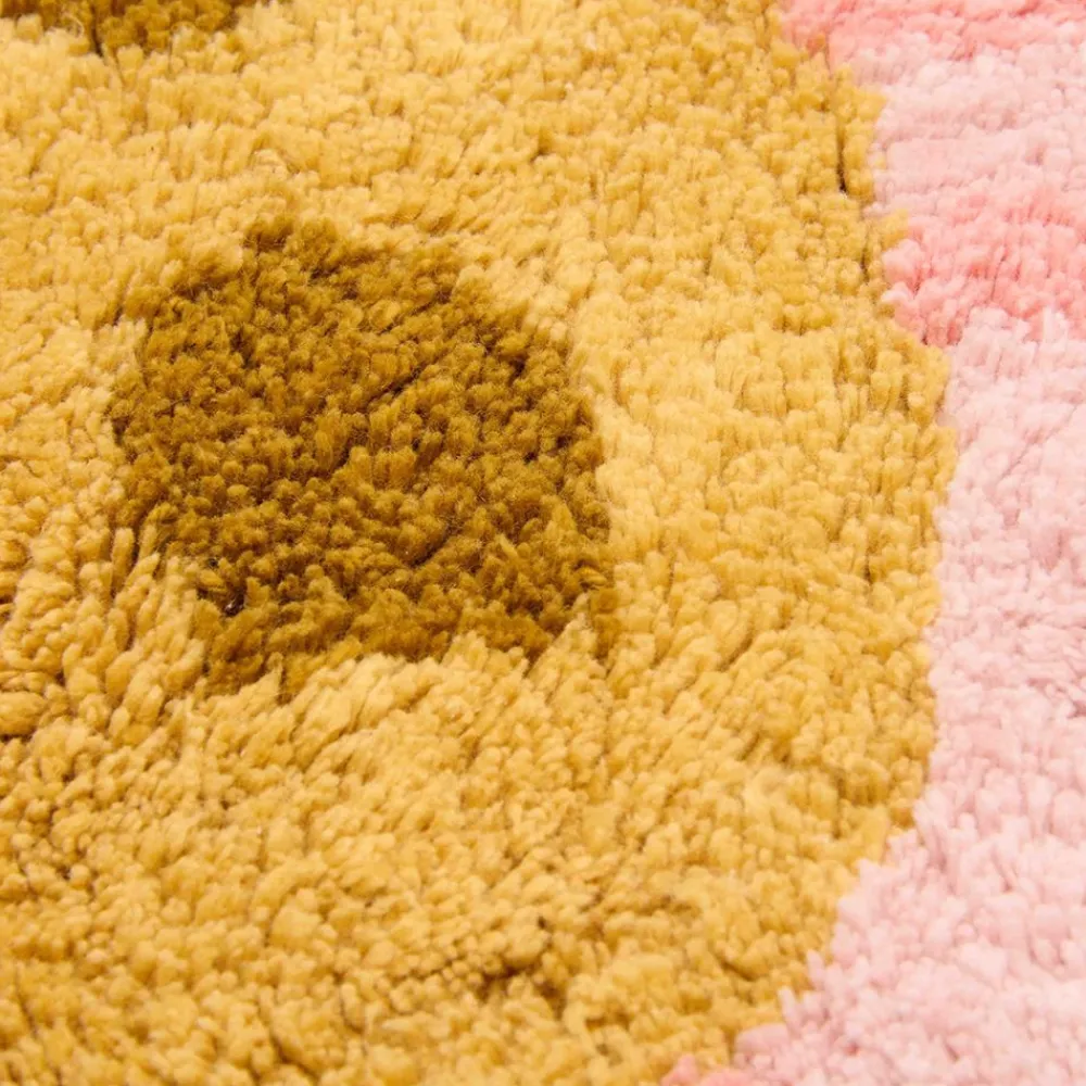Dette blomsterformede teppet har en myk beige kant med rosa kronblader og okergul senter. Teppet skaper en leken og koselig atmosfære i rommet. Laget av 100 % økologisk bomull og med en sklisikker lateksbakside, kan teppet enkelt rengjøres i både vaskemaskin og tørketrommel.