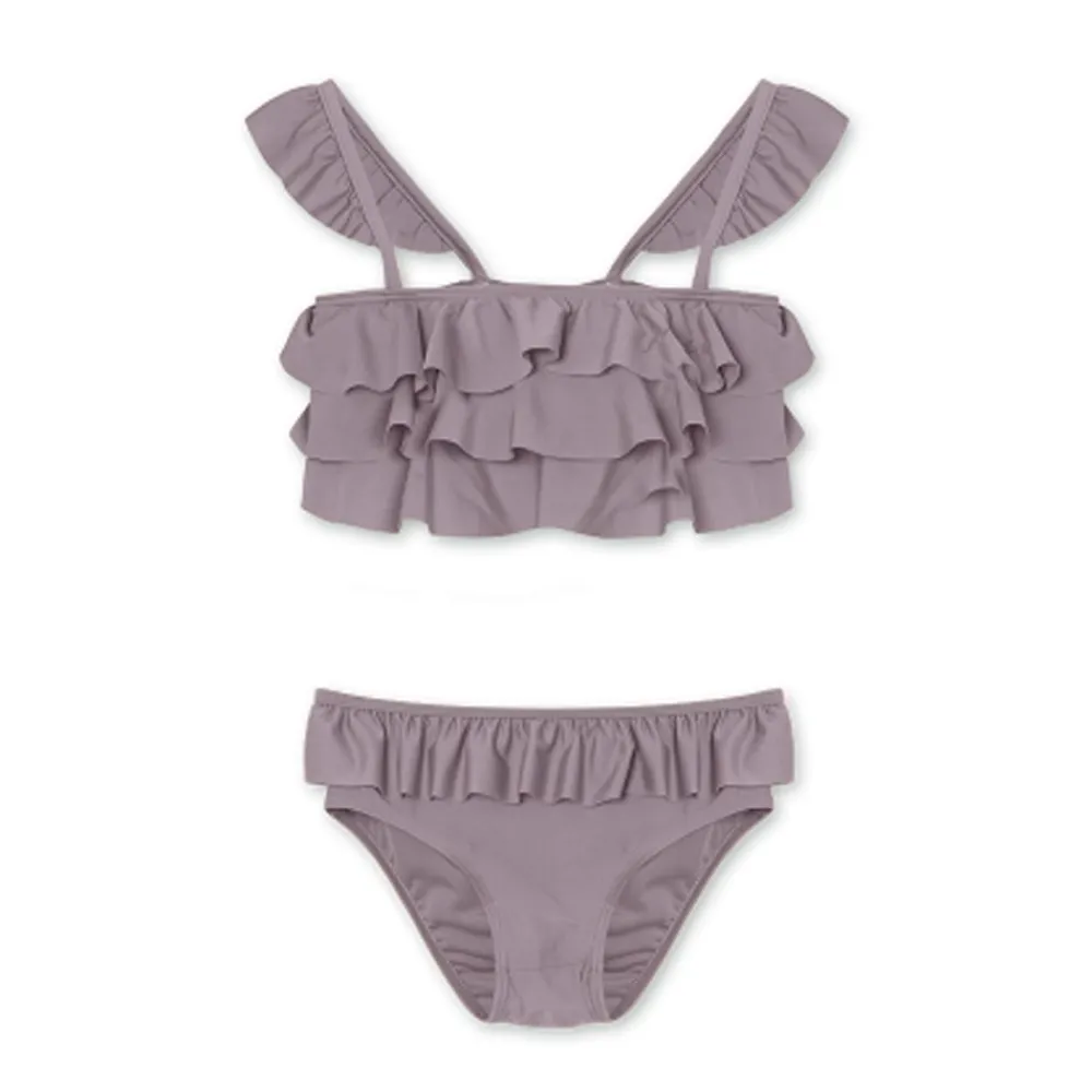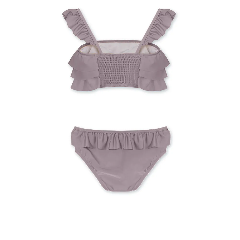 Denne fantastiske bikini’en har en utrolig søt og feminint design. Foran på overdelen og langs skulderstroppene finner man vakre lag med volanger som gir et lekent og delikat preg. Overdelen har en smock-rygg som tilpasser seg perfekt kroppen, slik at barnet kan føle seg komfortabel og trygg når de nyter solen på stranden eller ved bassenget.