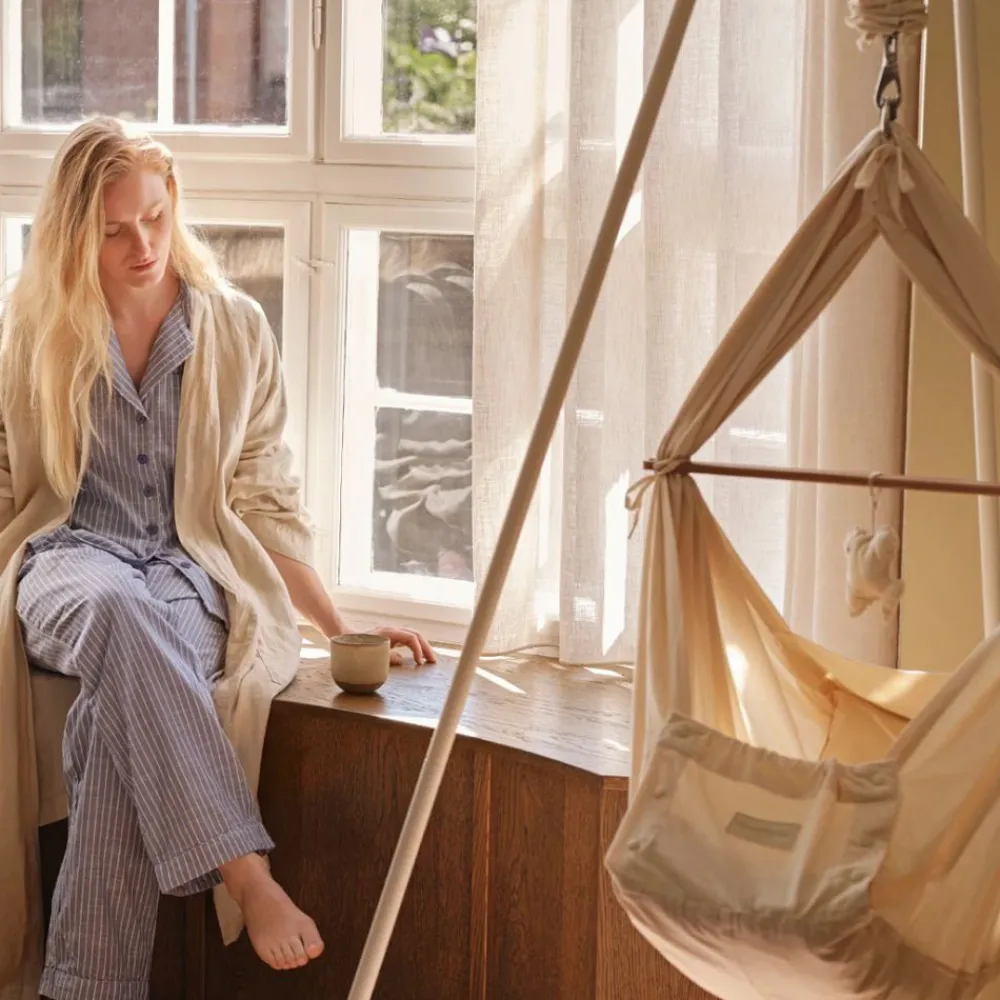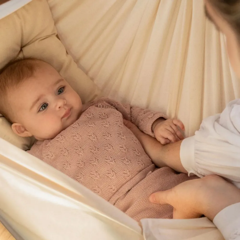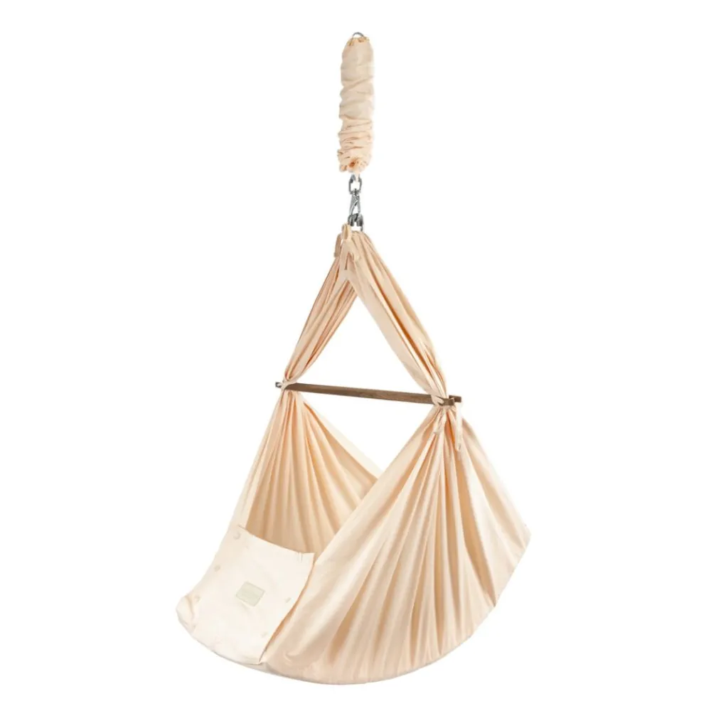Hengevuggen er designet og utviklet av søvneksperter i Danmark, og er laget av myke og gode materialer som GOTS-sertifisert økologisk bomull, kapok til madrassen og valnøttre til tverrpinnen, og er testet i henhold til de strengeste europeiske sikkerhetsstandardene. (Stativ og annet tilbehør selges separat)