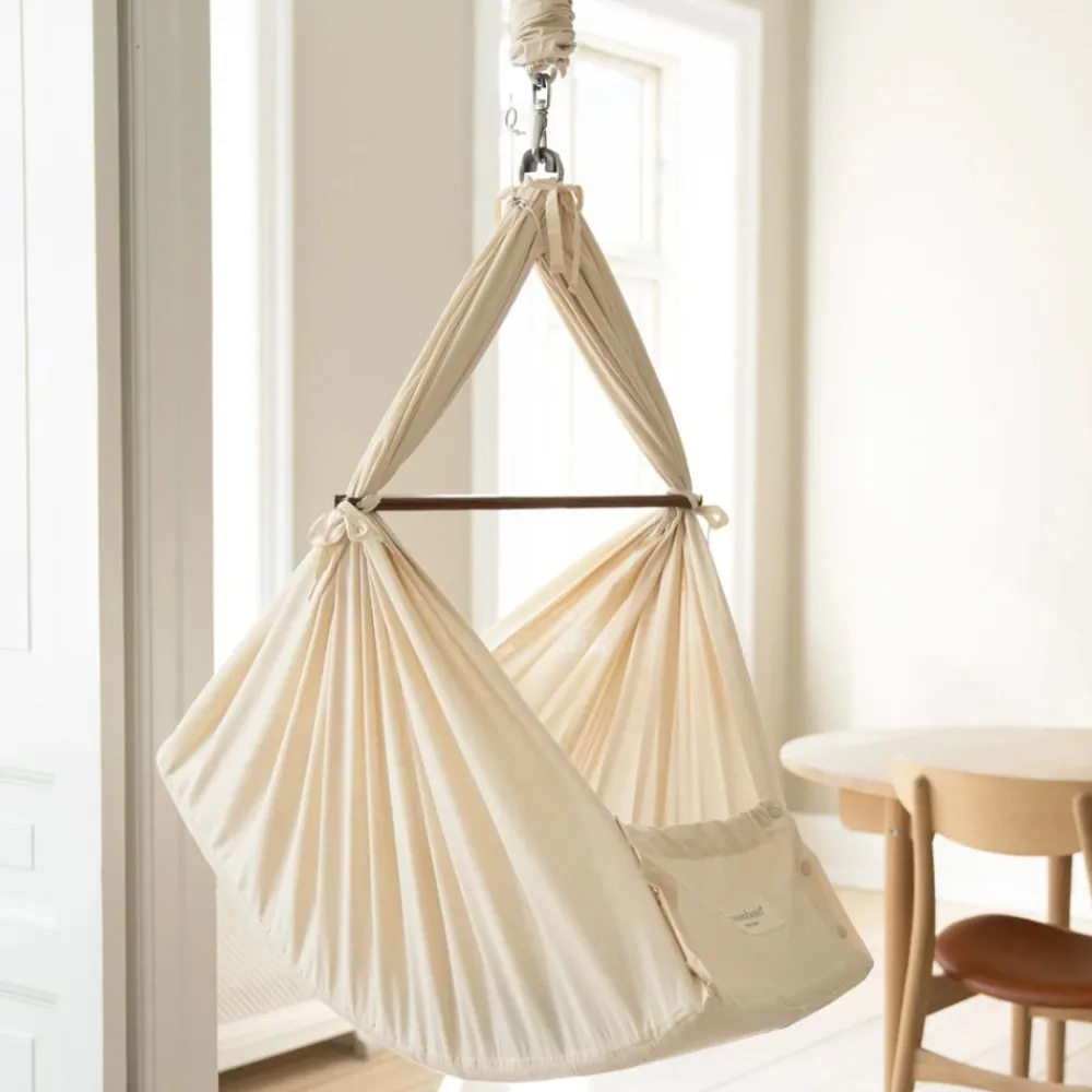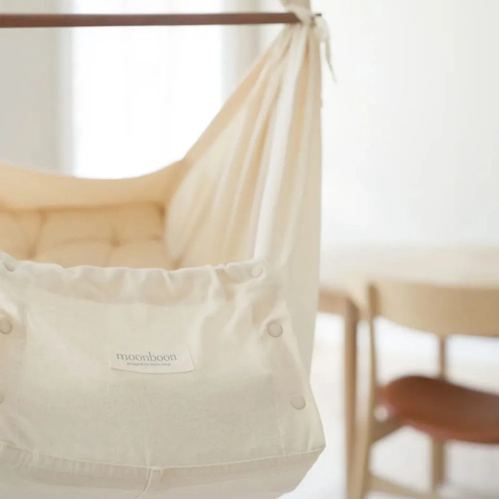 MoonBoon – en økologisk hengevugge som gir babyen din et trygt sted å hvile og sove. Fordi bare det beste er godt nok for babyen din, er babyhengekøyene fra MoonBoon laget av 100 % økologisk bomull og inkluderer en naturlig, hypoallergen madrass laget av kapok.