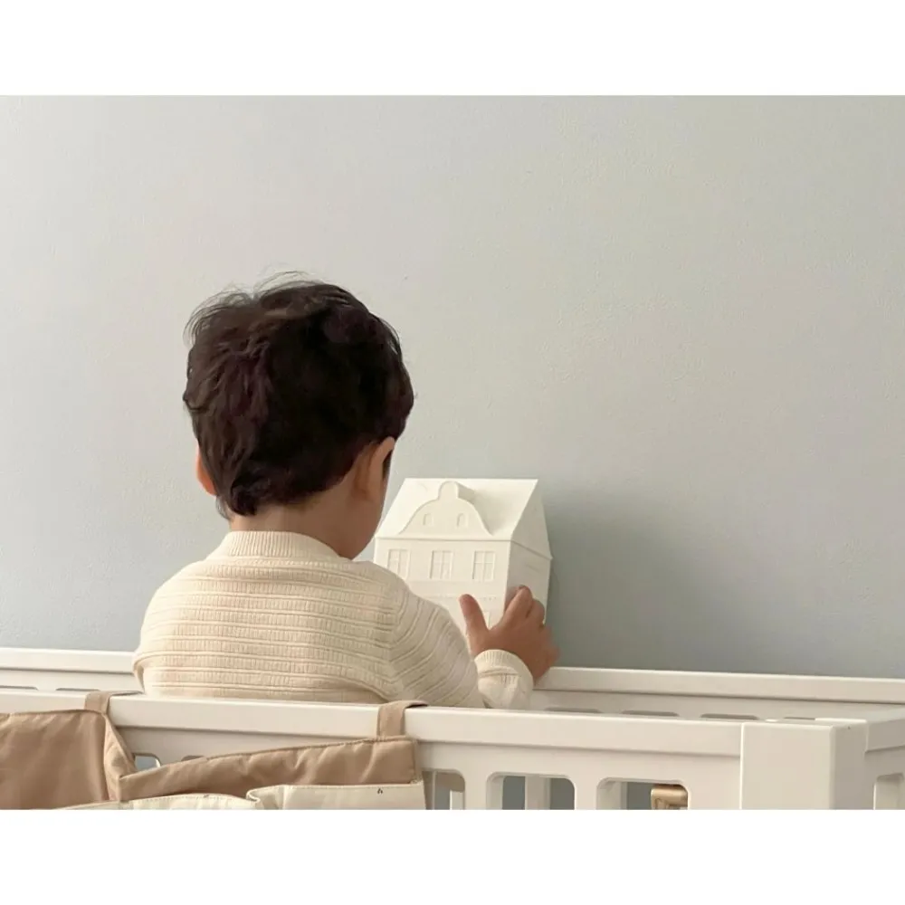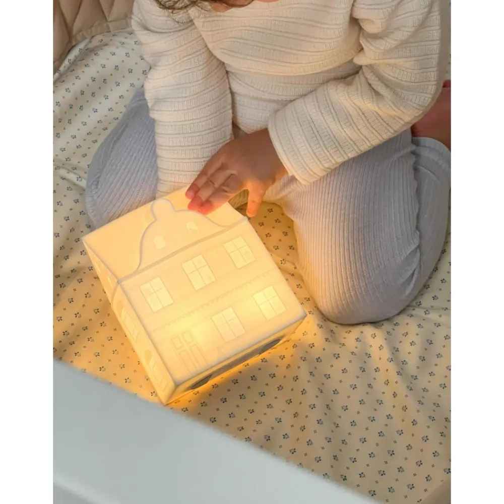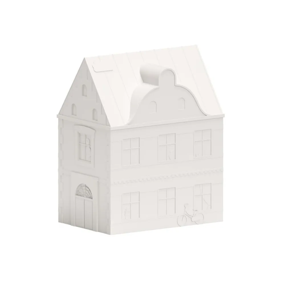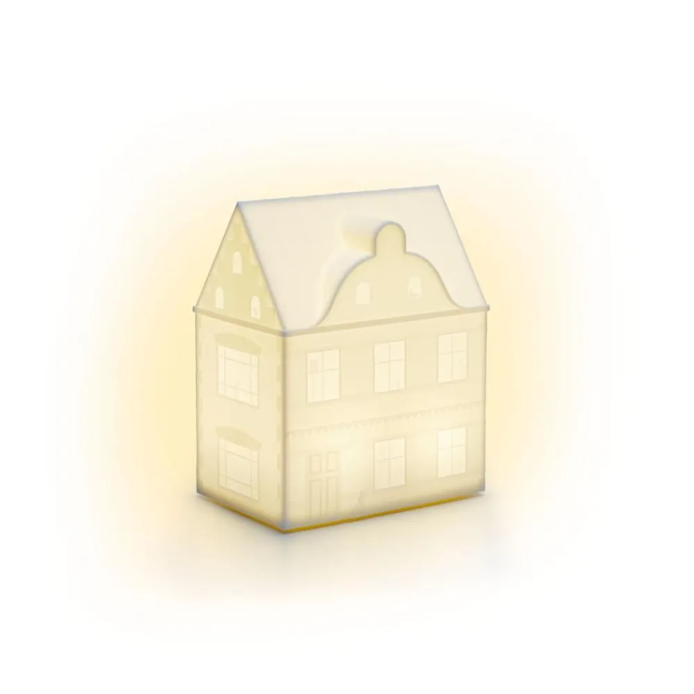 Denne sjarmerende nattlampen er designet for å ligne et klassisk byhus i København, med intrikate detaljer som forteller små historier – en gravid dame i et vindu, en hund foran huset og en sykkel på den andre siden.