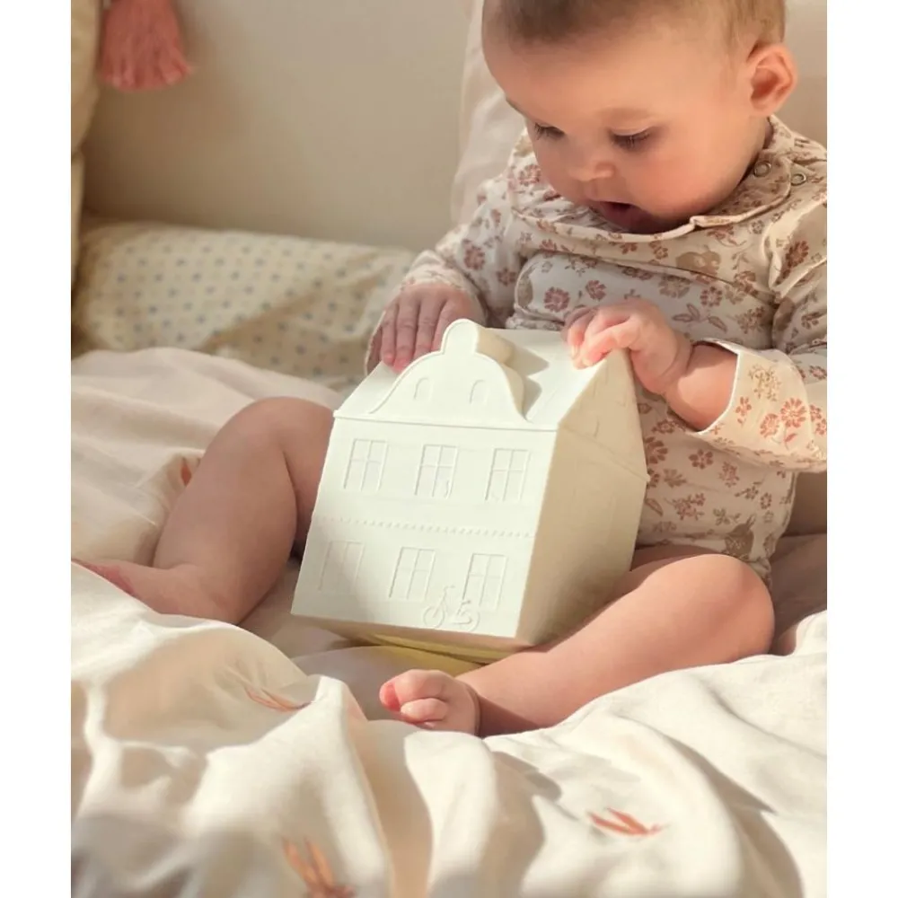 Lampen er laget av off-white silikon og har en lekende fargeendringsfunksjon; den kan endre farge når den klemmes eller bankes, og tilfører et morsomt element til barnets natterutine. Med sin varme, myke glød skaper den en koselig og beroligende atmosfære, perfekt for å vekke fantasifulle drømmer. Den er også ideell som et skånsomt lys ved skifteområdet og for nattmating.