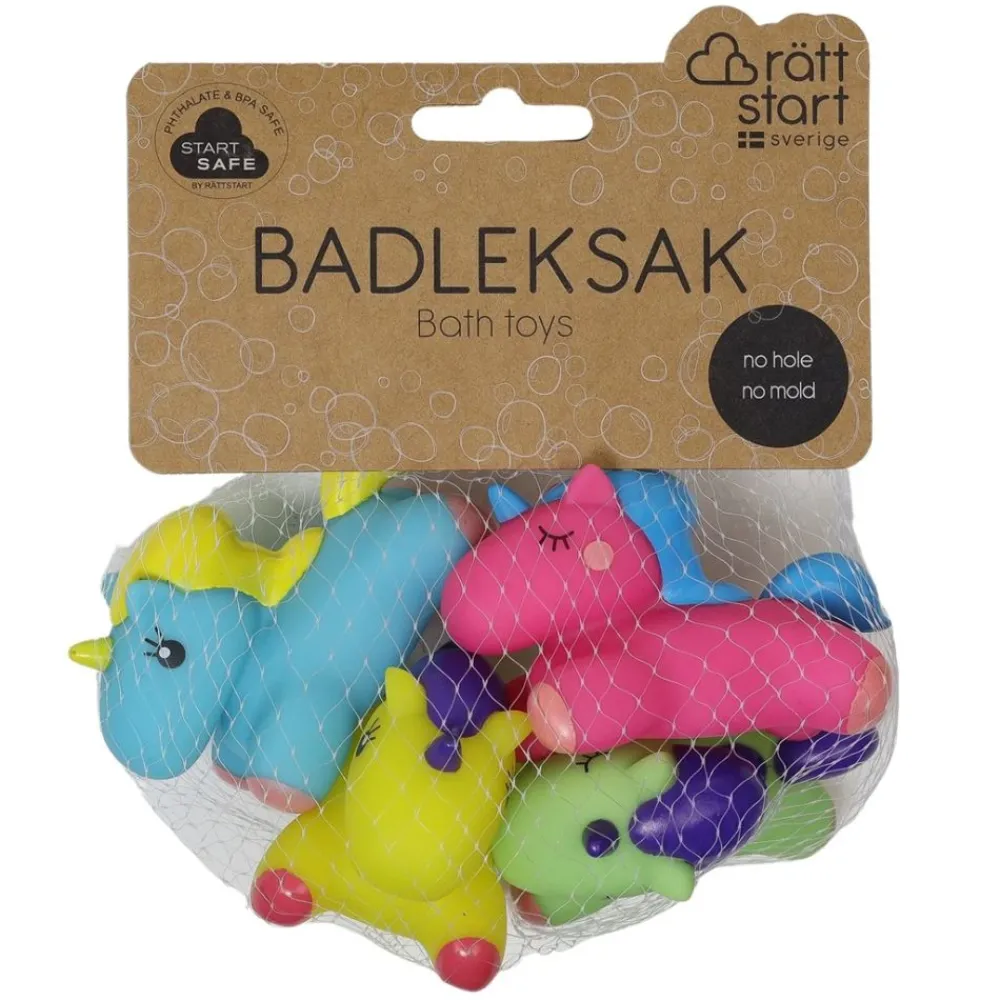 Gjør badetiden til en gøyal tid sammen med fine fargerike enhjørninger. Badelekene er lett å gripe for små barnehender. Anbefales fra 12mnd+. Pakken inneholder 4 badeleker.