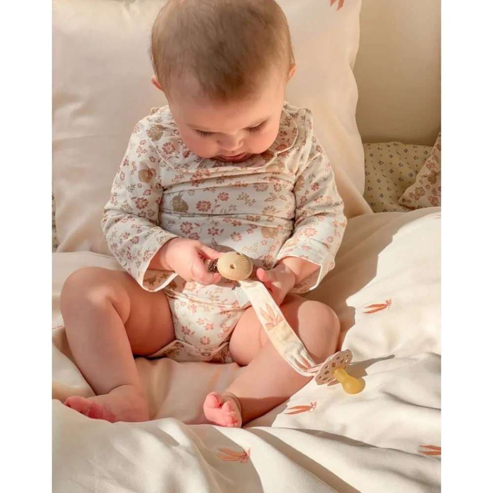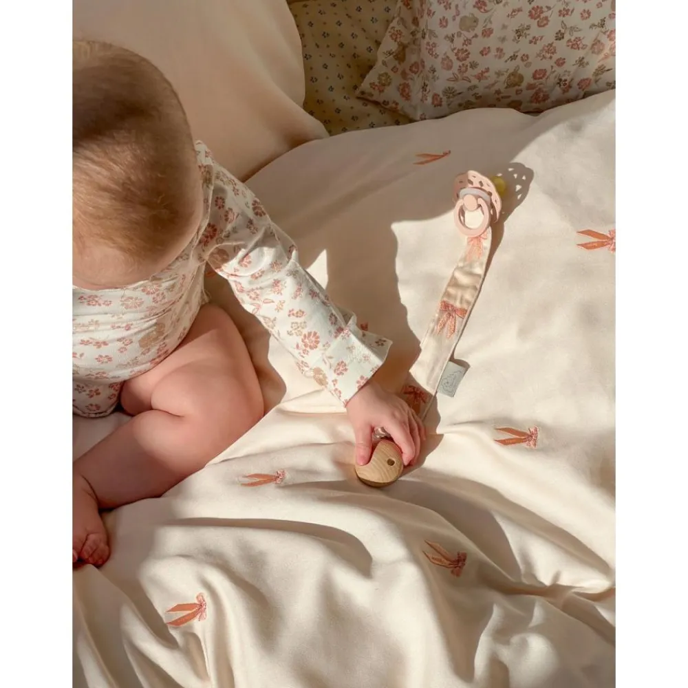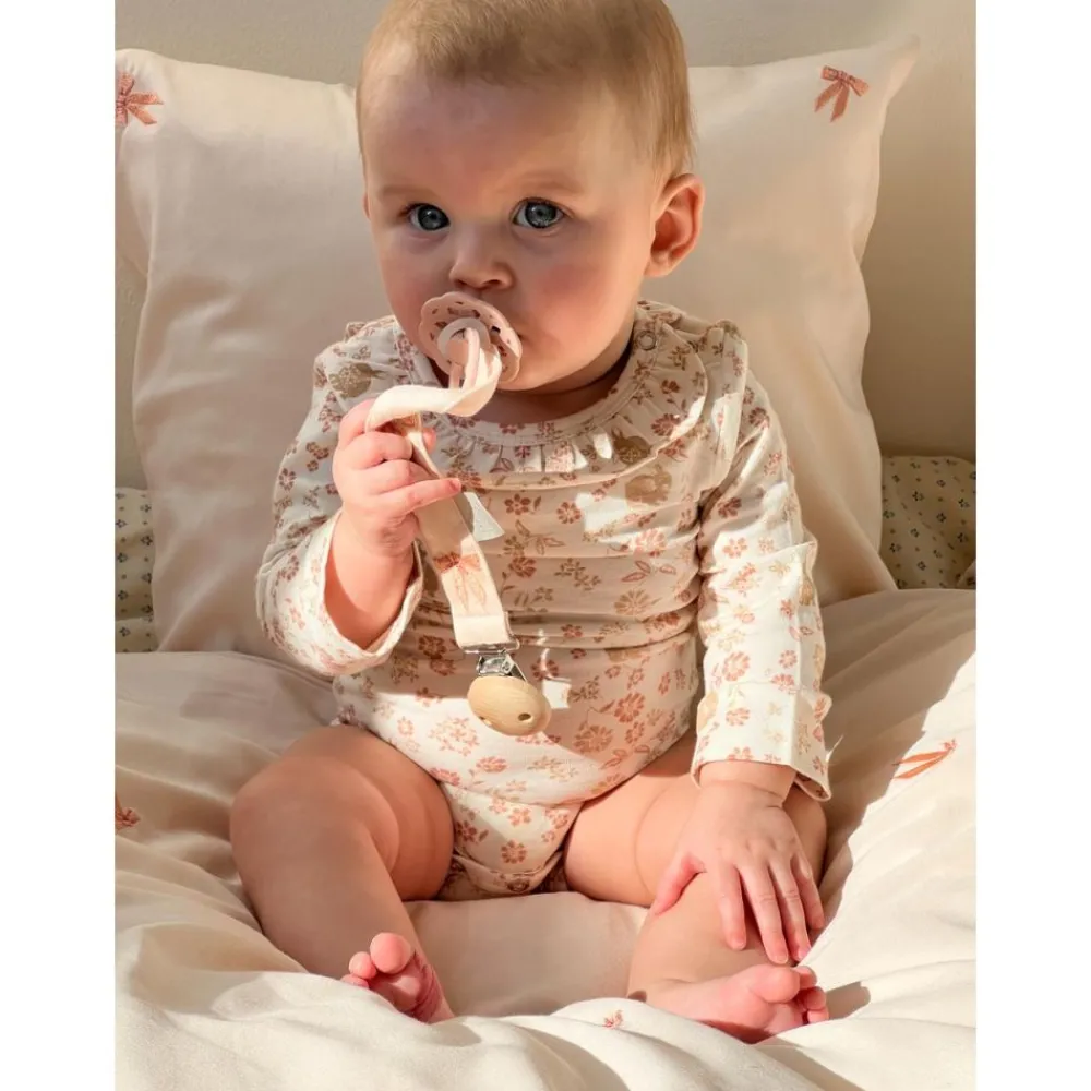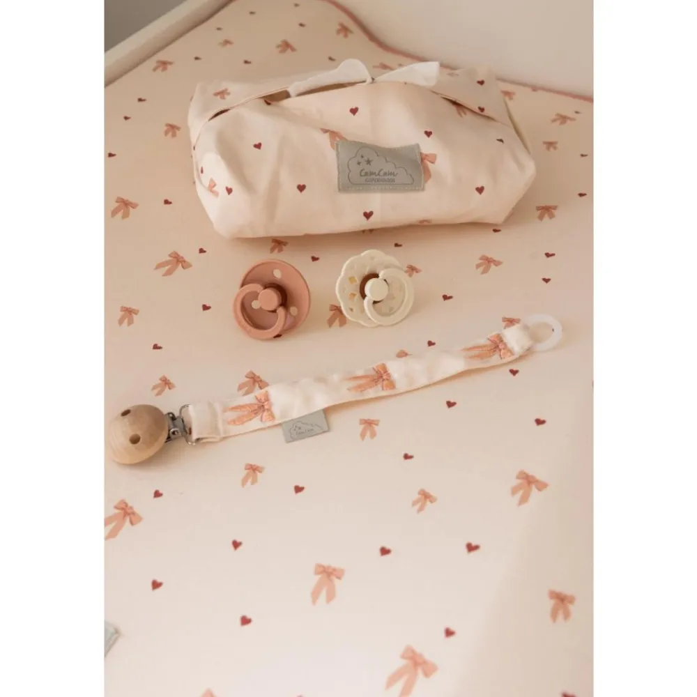 Hold babyens smokk innen rekkevidde og fra gulvet med Cam Cam sin fine og broderte smokkholder i det romantiske buedesignet. Den sikre klypen festes enkelt til babyens klær, og sikrer at smokken forblir ren og i nærheten. Smokkholderen kombinerer funksjonalitet med en lunefull touch, noe som gjør den til et praktisk og stilig tilbehør for den lille.