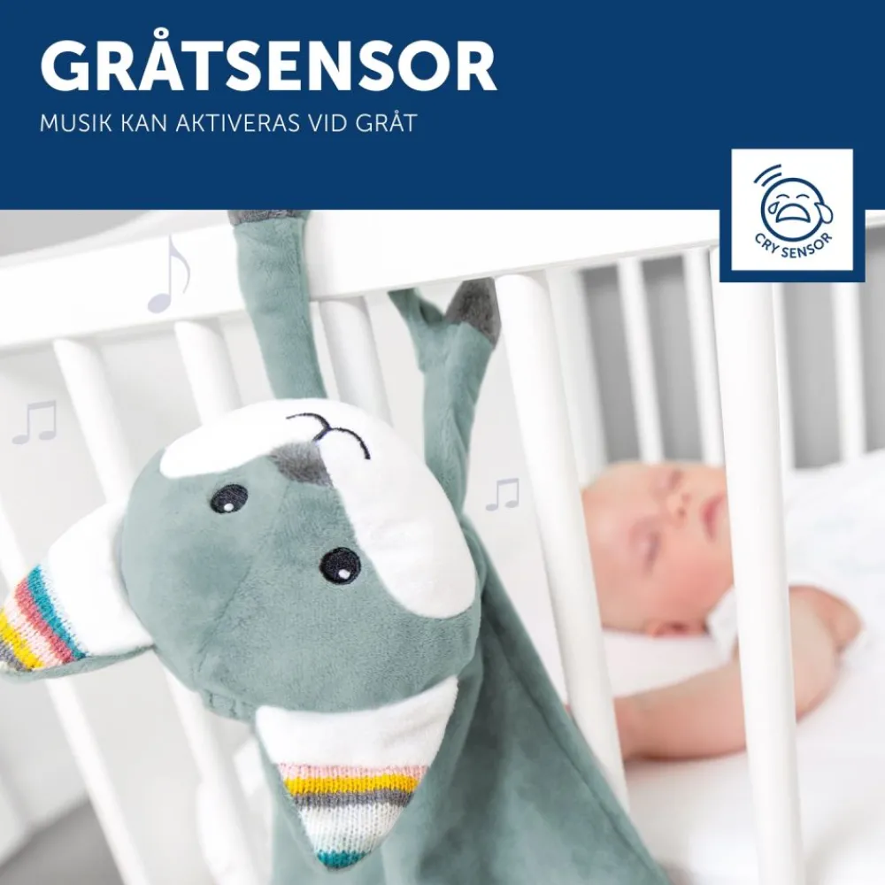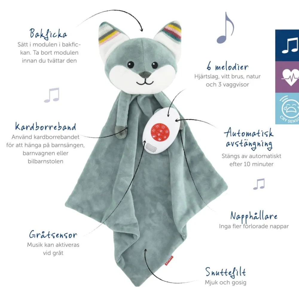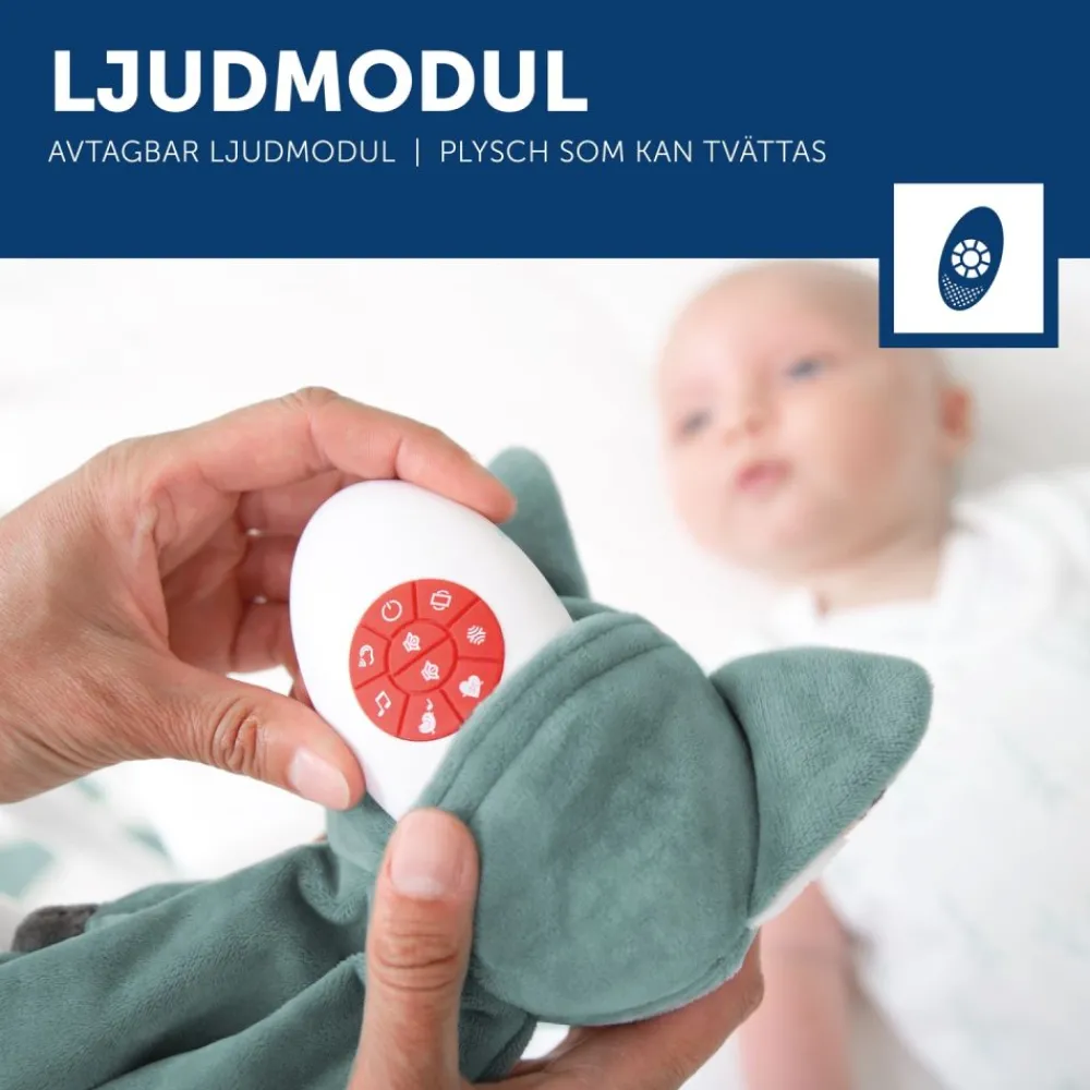 Et mykt smokketeppe med beroligende musikk som du kan ta med deg overalt. Du kan også feste smokken til den lille, slik at den ikke går tapt. Velg mellom hjerteslaglyder, hvit støy, naturlyder eller 3 beroligende vuggeviser. Timerfunksjonen slås av automatisk etter 10 minutter, mens gråtsensoren sørger for at den sist spilte lyden slås på igjen når babyen din gråter. Volumet kan justeres. Med borrelås kan du feste denne kosekluten til barnevognen, bilsetet eller vuggen.