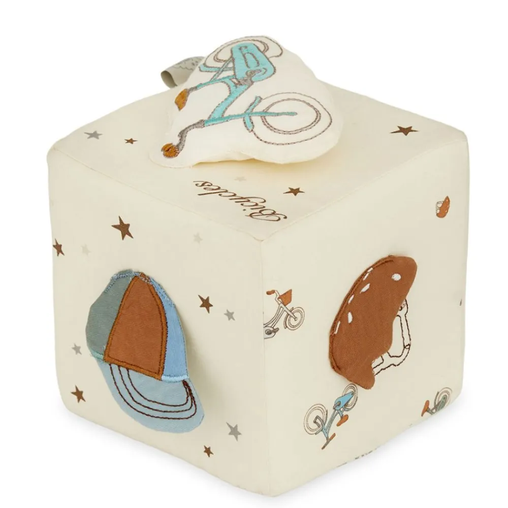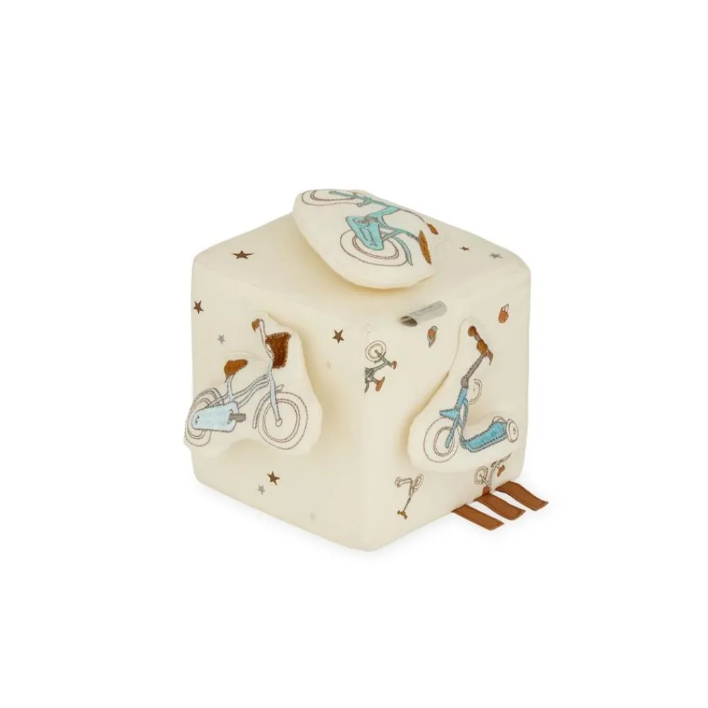 Myk og leken activitetskube inspirert av Cam Cam sitt herlige sykkeltrykk. Hver side av aktivitetskuben har multi-sensoriske lekemuligheter, morsomme krøllete teksturer, squeaker, trekkfaner, speil og en liten klirrende bjelle, som garantert stimulerer babyens nysgjerrighet og fantasi.