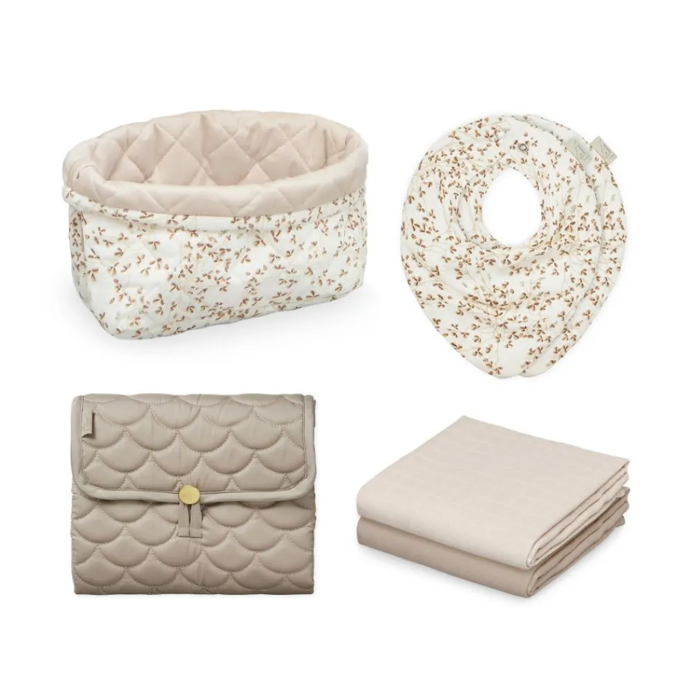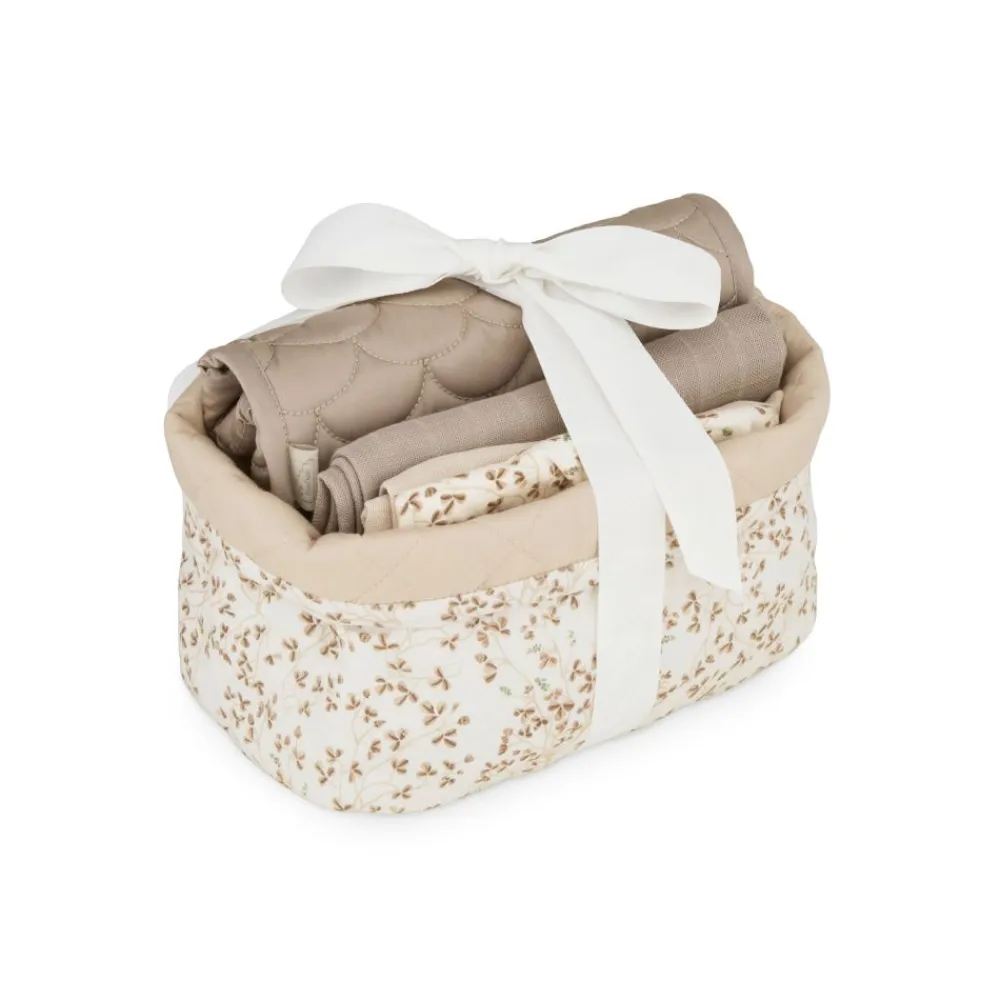 Dette nydelige settet inneholder utvalgte pleiebestselgere laget av myk, økologisk bomull – ideelt for både hjemmebruk og familielivet på farten. Den vatterte oppbevaringskurven passer perfekt på stellebordet og inneholder 2 myke smekker som er skånsomme mot babyens hud. En bærbar stellematte og 2 ensfargede muslinkluter. Ideelt for både hjemmebruk og familielivet på farten.
