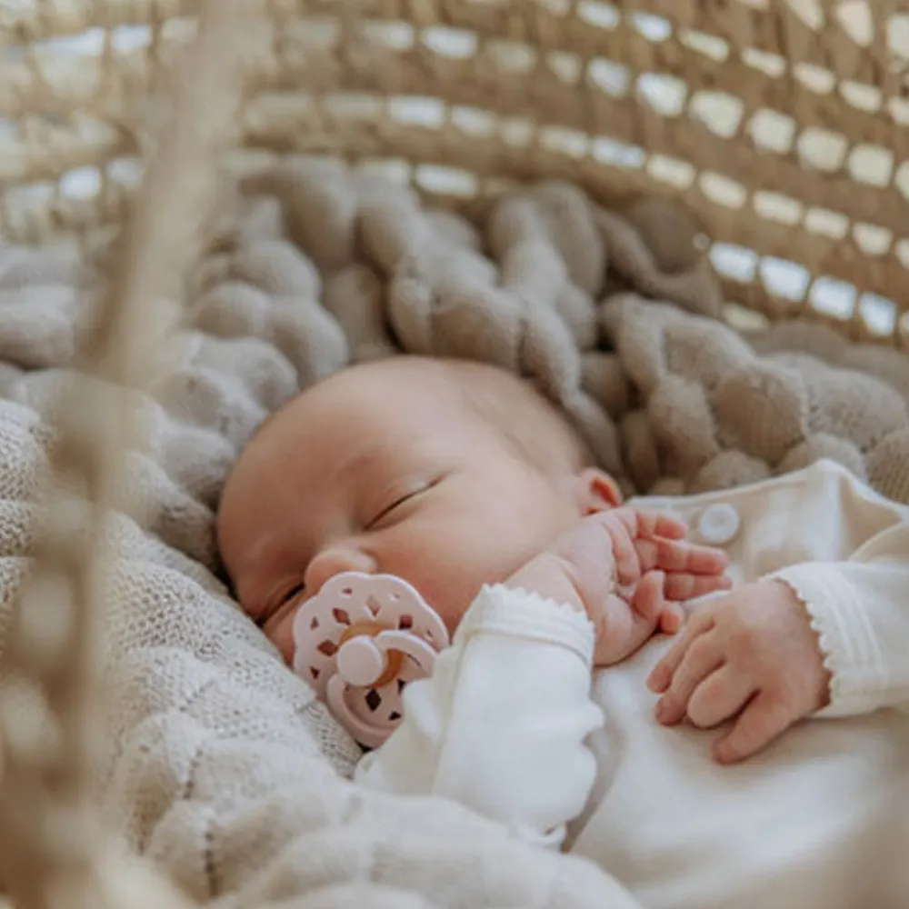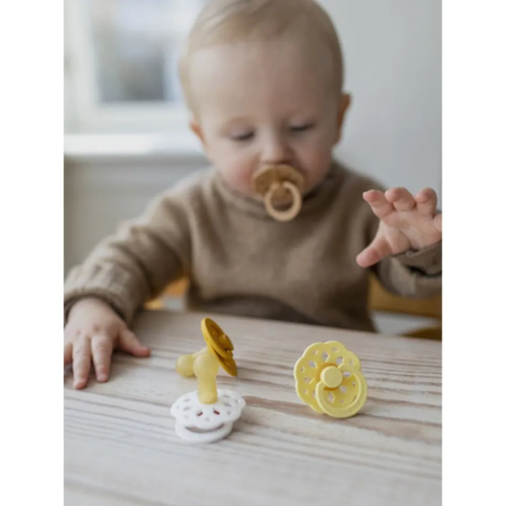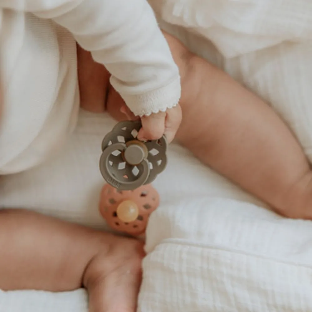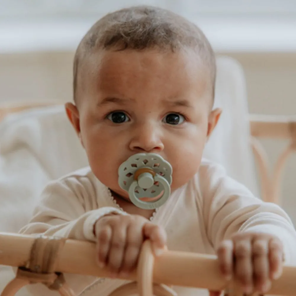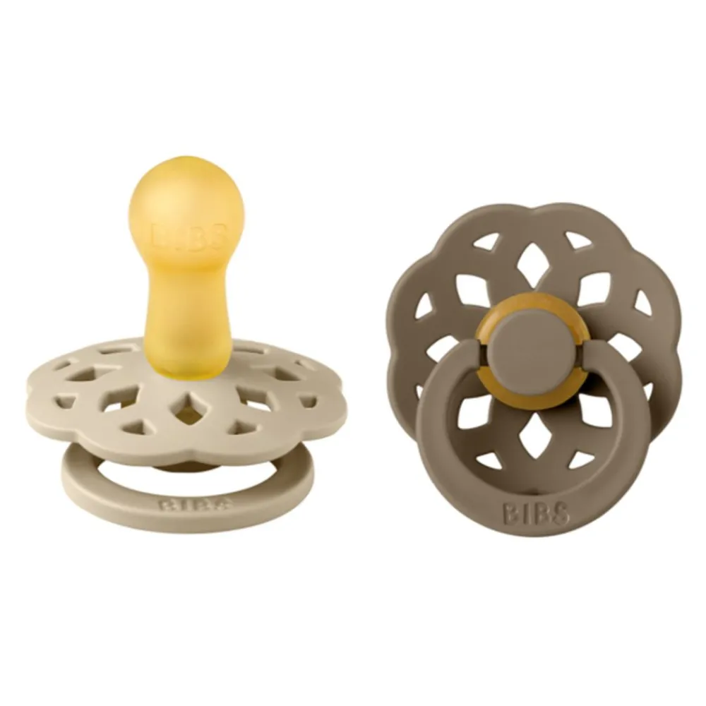 BIBS Boheme-smokker er inspirert av den moderne bohemstilen og laget av naturgummilatex, designet for å støtte naturlig amming. Brystvorten er utstyrt med en ventil som slipper ut luft når babyen lukker seg på brystvorten og dermed flater ut brystvorten til å forme seg naturlig etter babyens munnhule. Det runde lettvektsskjoldet vender bort fra den sensitive og sarte huden rundt babyens munn for å sikre minimal kontakt med babyens nese og munn, noe som betyr mindre sjanse for fuktighetsoppbygging fra spytt som kan forårsake utslett og såre flekker.