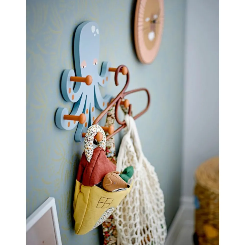 Oswall Knaggrekke fra Bloomingville MINI er en sjarmerende blekksprut som bringer både moro og orden på barnerommet. Med sin støvete blå farge og rødlige nyanser på krokene skaper den en koselig atmosfære og fanger barnets oppmerksomhet. De seks armene, hver med en solid krok, holder enkelt yttertøy, vesker og utkledningsklær.