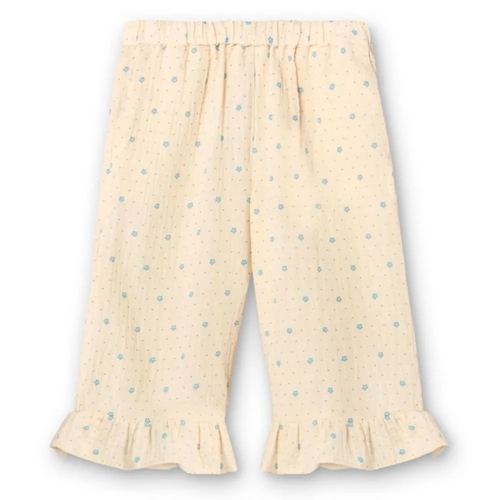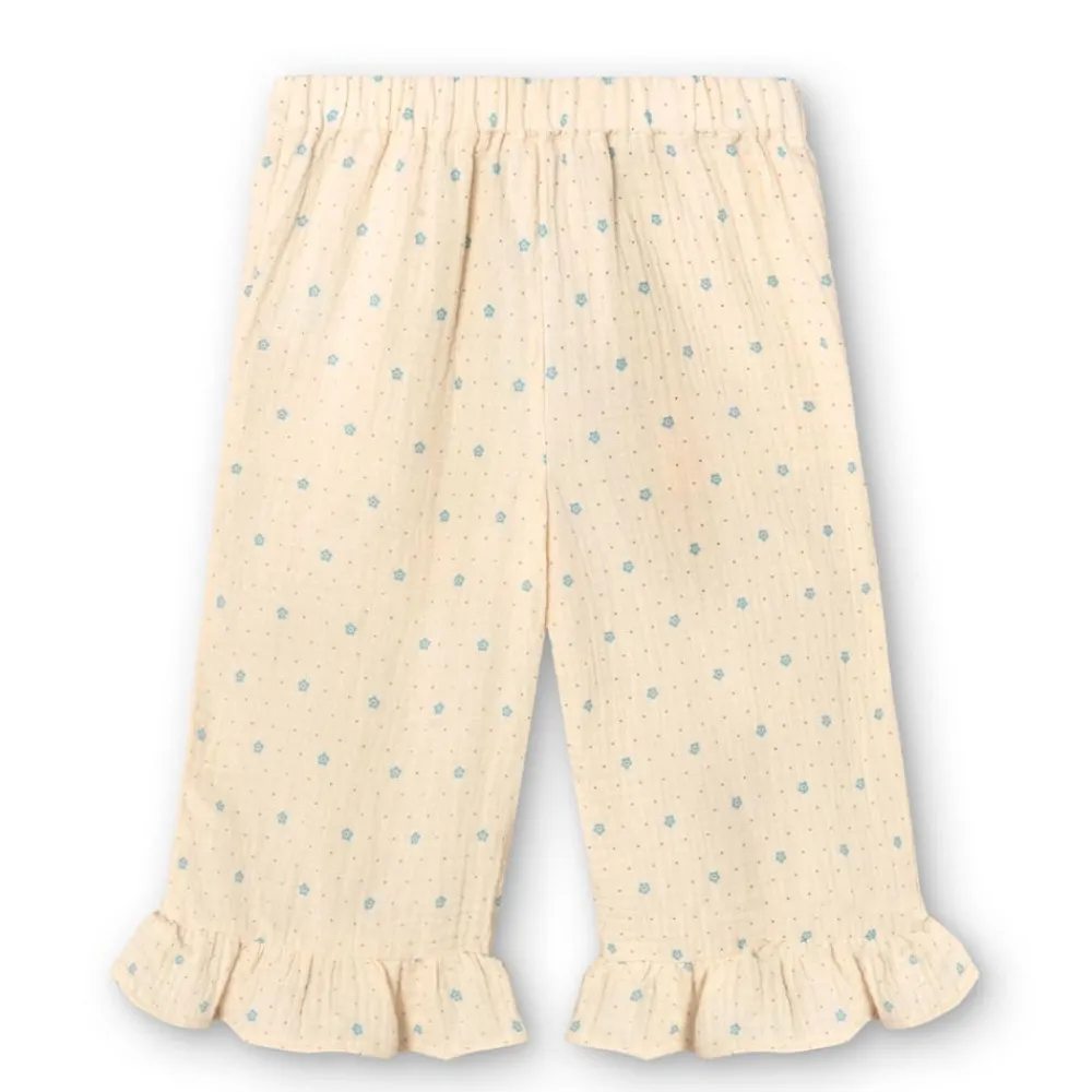 Gi antrekket ditt en søt og bærekraftig touch med denne buksen i økologisk bomull. Det myke, behagelige stoffet har et sjarmerende blomstermønster i delikate nyanser, og de lekne rysjekantene nederst på beina gir en feminin vri. Den elastiske midjen sikrer en behagelig passform, og kombinasjonen av komfort og stil gjør denne buksen til et perfekt valg for både hverdagsbruk og spesielle anledninger.