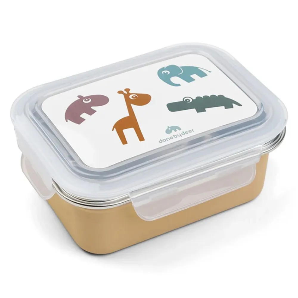 Matboksen i metall fra Done By Deer er et must når du er på farten. Metallboksen er perfekt til din barnets lunsj, og plastlokket lukkes tett på matboksen i rustfritt stål. Matboksen i metall er laget av kvalitetsstål – 18/8 rustfritt stål – som gjør matboksen svært slitesterk og langvarig. Det er ingen belegg på innsiden av matboksen og den avgir ingen form for smak eller kjemikalier.