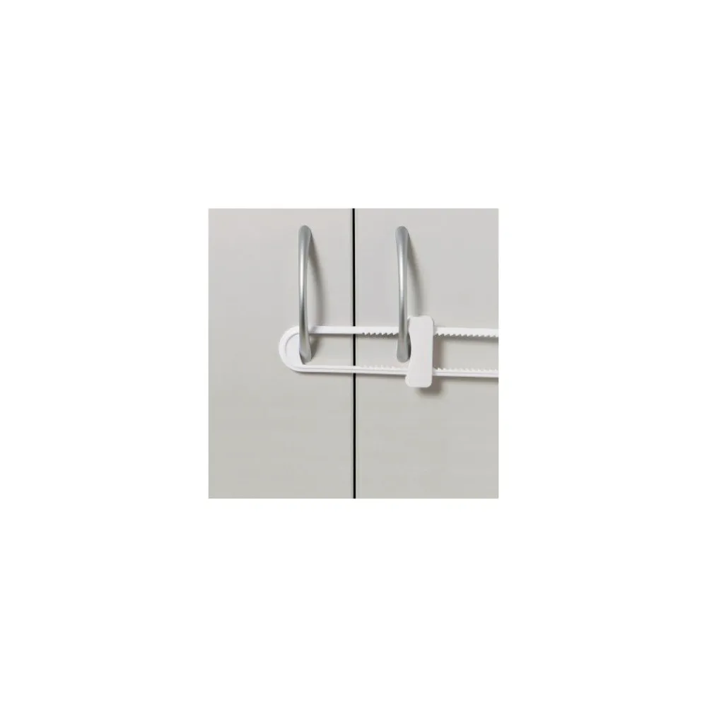 Skaplåsen er en rask og sikker måte å låse skap og skapdører på, slik at småbarn ikke får tilgang på det som er inni. Krever ingen installasjon, bare trykk ned og skyv låsen tett mot håndtakene.