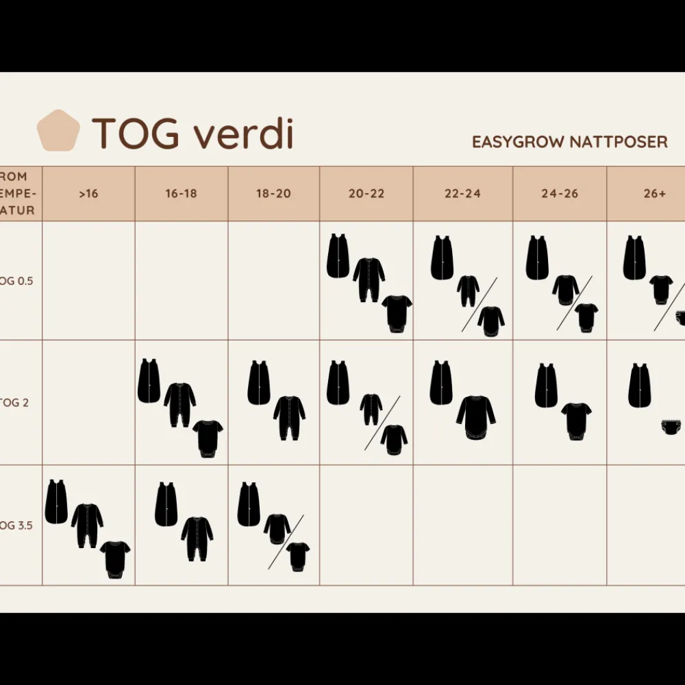 Nattposen har en TOG verdi på 2 noe som er tilpasset Nordiske forhold og anbefalt romtemperatur er 16-25 grader. Bruk av dyne i tillegg og eventuell påkledning kommer an på romtemperatur og andre forhold som må tilpasses hvert enkelt barn. Nattposene er godkjent etter BS EN 16781: 2018. Oeko-Tex sertifiserte tekstiler (21.HCN.45383)