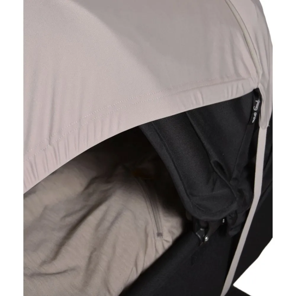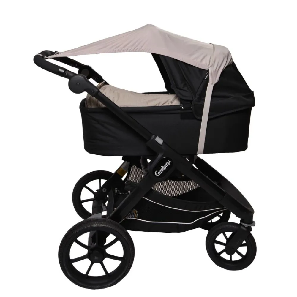 En super praktisk solskjerm for barnevogn. Du fester den over kalesjen med et elastisk bånd under ryggen/baggen. Solskjermen ligger inne i en lang lomme med glidelås. Når solen kommer frem åpner du enkelt lommen og drar ut solskjermen. Den har stropper i hvert hjørne som knytes til håndtaket. Solskjermen dekker mye og gir godt med skygge, samtidig som den slipper inn masse luft fra sidene slik at det ikke blir varmt i vognen. Du kan også skyve skjermen oppover stroppene slik at du kan se barnet. Easygrow solskjerm er universal og passer på alle vogner, både med bag og sittedel hvor barnet er vendt mot deg og håndtaket. Den beskytter godt mot solen med UPF 50+ mot både UVA og UVB stråler.