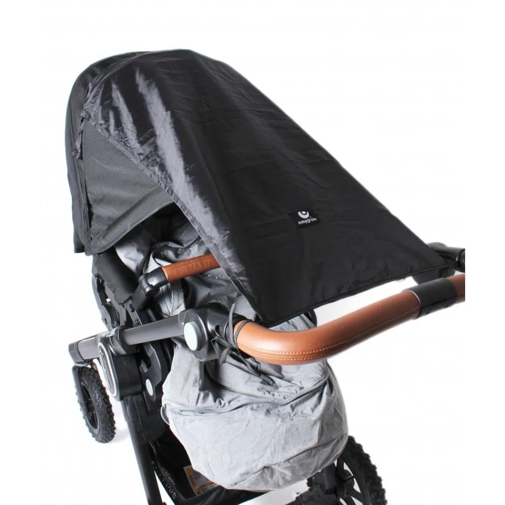 En super praktisk solskjerm for barnevogn. Du fester den over kalesjen med et elastisk bånd under ryggen/baggen. Solskjermen ligger inne i en lang lomme med glidelås. Når solen kommer frem åpner du enkelt lommen og drar ut solskjermen. Den har stropper i hvert hjørne som knytes til håndtaket. Solskjermen dekker mye og gir godt med skygge, samtidig som den slipper inn masse luft fra sidene slik at det ikke blir varmt i vognen. Du kan også skyve skjermen oppover stroppene slik at du kan se barnet. Easygrow solskjerm er universal og passer på alle vogner, både med bag og sittedel hvor barnet er vendt mot deg og håndtaket. Den beskytter godt mot solen med UPF 50+ mot både UVA og UVB stråler.
