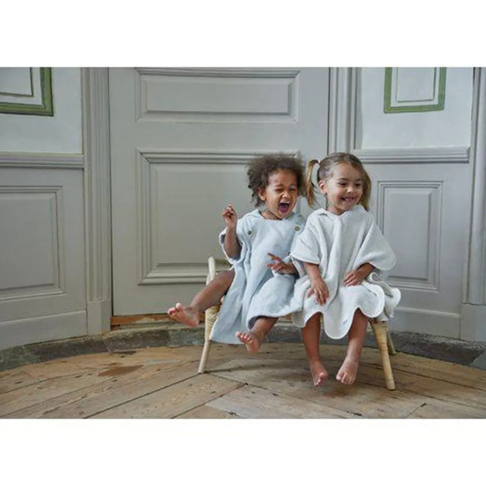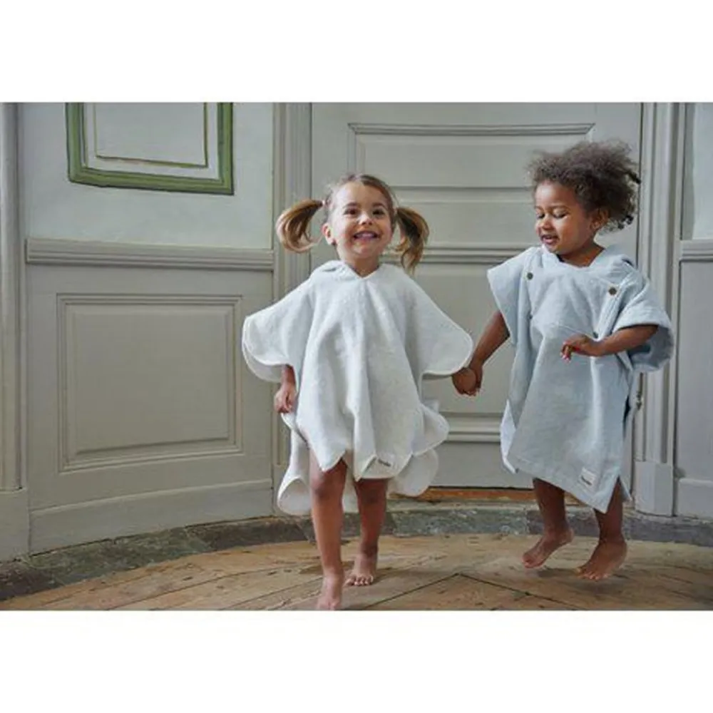 Tre den over hodet og fest trykknappene så du har en romslig og komfortabel poncho som gir maksimal bevegelighet og fortsatt holder seg som den skal under lek. Utsiden er en fantastisk myk bomull som gjør klemmen etter badet enda deiligere.