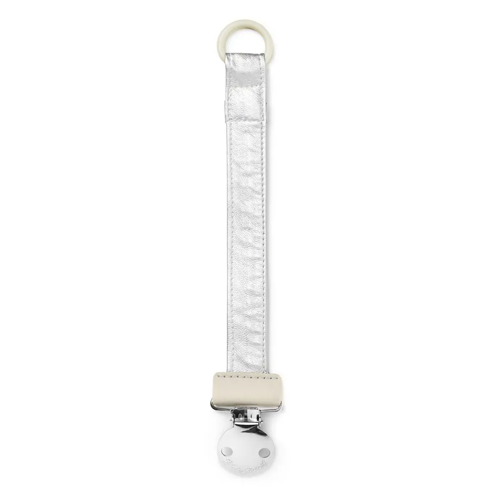Fest metallspennen til babyens klær og silikonringen på smokken, slik at du kan være sikker på at smokken ikke kommer av eller havner på bakken og blir skitten.