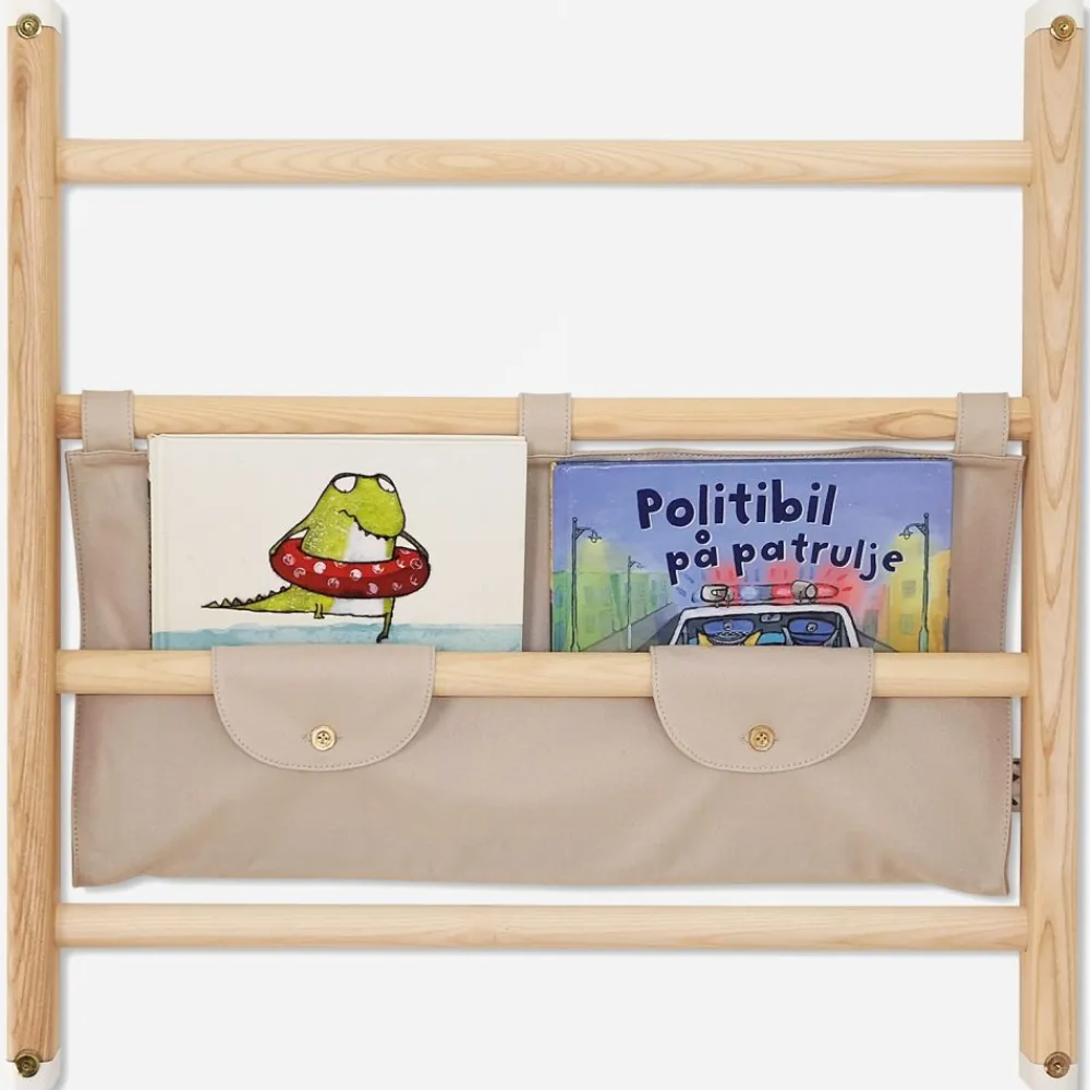 Endeløs-systemets hyller er allsidige og passer like godt til å oppbevare bøker og magasiner som til leker, luer og votter. Hyllen er laget av slitesterk bomull som tåler bruk over lang tid, og er enkel å feste på ribbene ved hjelp av stilige messingknapper. Dette gir deg en praktisk og elegant måte å organisere og oppbevare ting på, samtidig som det gir en flott estetisk touch til ethvert rom.