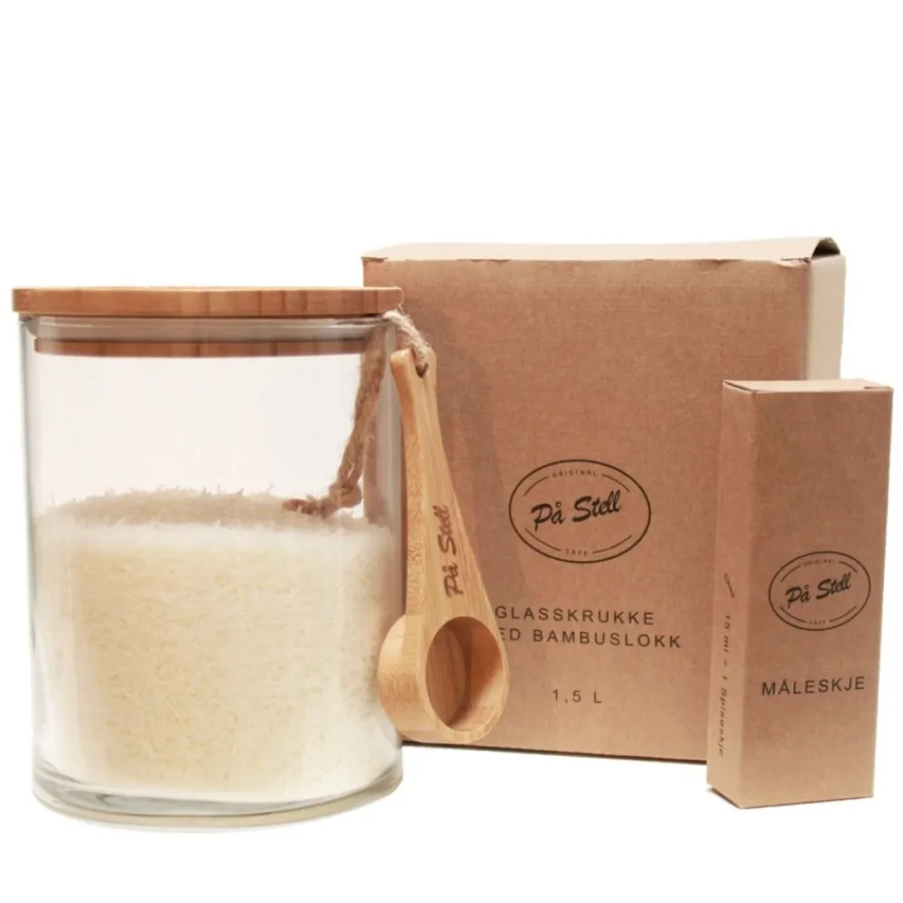 Med luft-tett lokk bevares den naturlige sitronduften lenger. Det følger også med måleskje tilsvarende 1 spiseskje (15ml) som er normal dosering per vask. Måleskjeen kan også benyttes til Ullvask, som har samme doseringsmål.