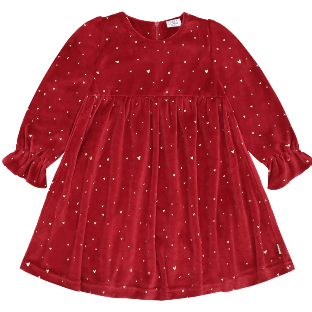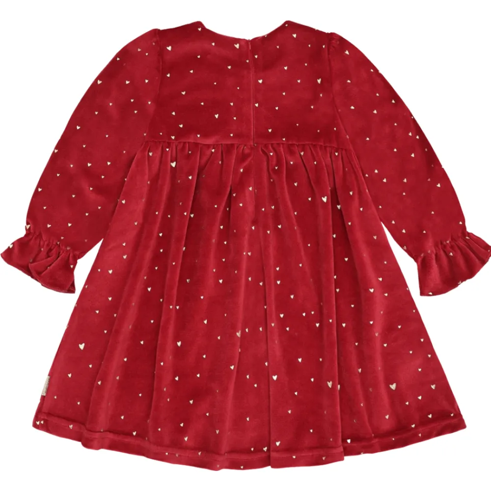 Nydelig rød kjole i myk velur fra Hust & Claire. Kjolen har små gullfargede hjerter spredt over hele stoffet som gir et festlig og elegant uttrykk. Den har lange ermer med fine volangdetaljer og knapp i nakken for enkel påkledning. Perfekt til jul, bursdag eller andre spesielle anledninger.