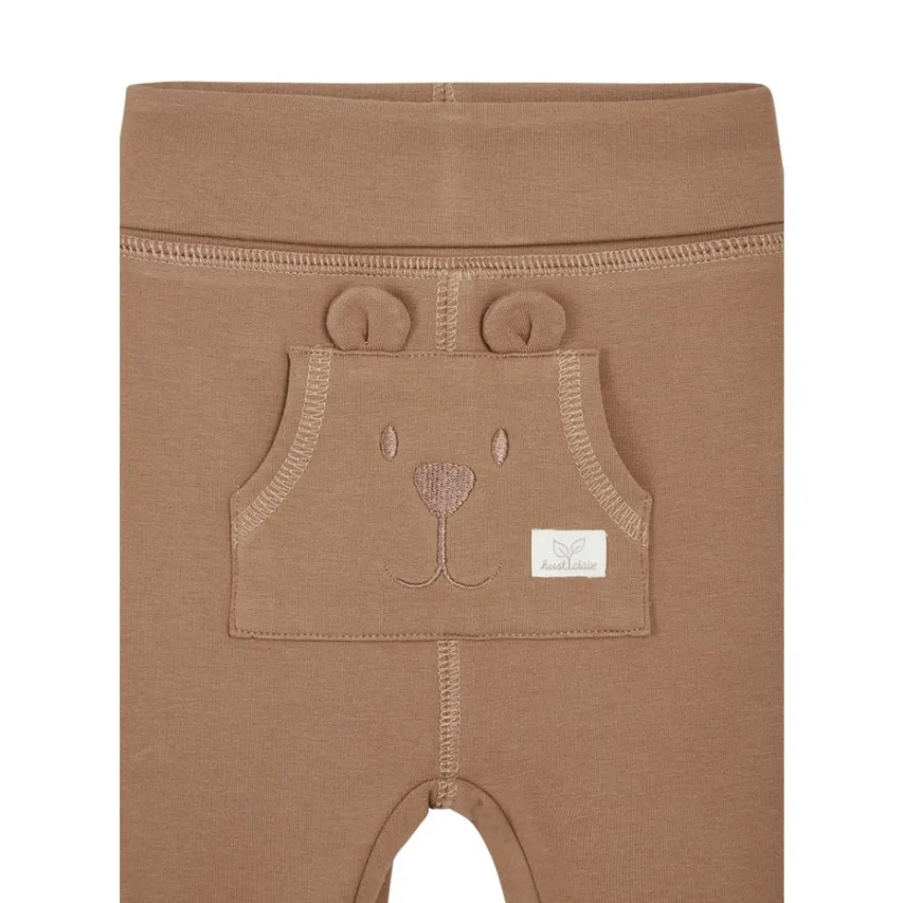 Søt og behagelig joggebukse fra Hust&Claire i myk bomull. Lommen har et brodert teddybjørnefjes med påsydde ører. Nedre del av buksen er det foldefot som kan brettes rundt føttene.