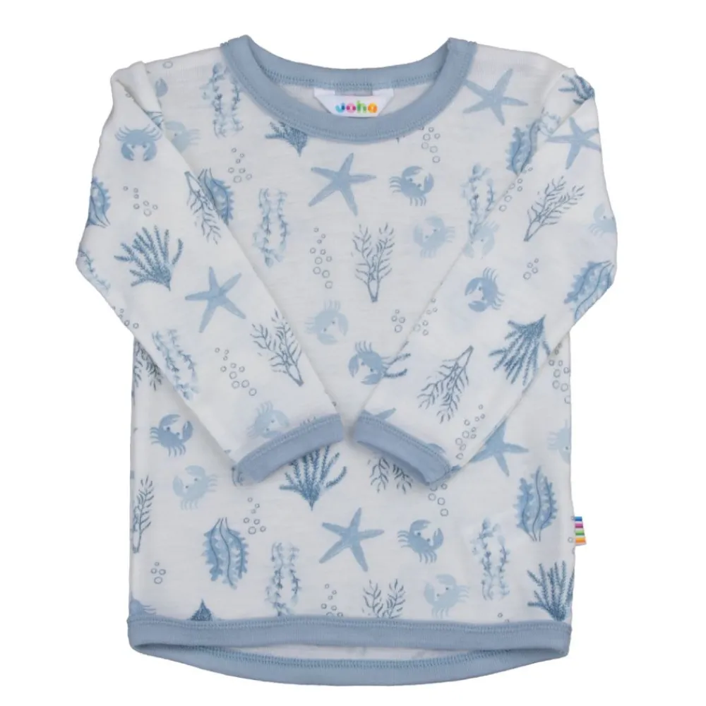Kle barnet ditt i den mykeste komforten med genser i 100% merinoull, pyntet med et sjarmerende motiv av krabber og sjøstjerner. Denne bodyen er både funksjonell og søt – en perfekt kombinasjon for de minste.