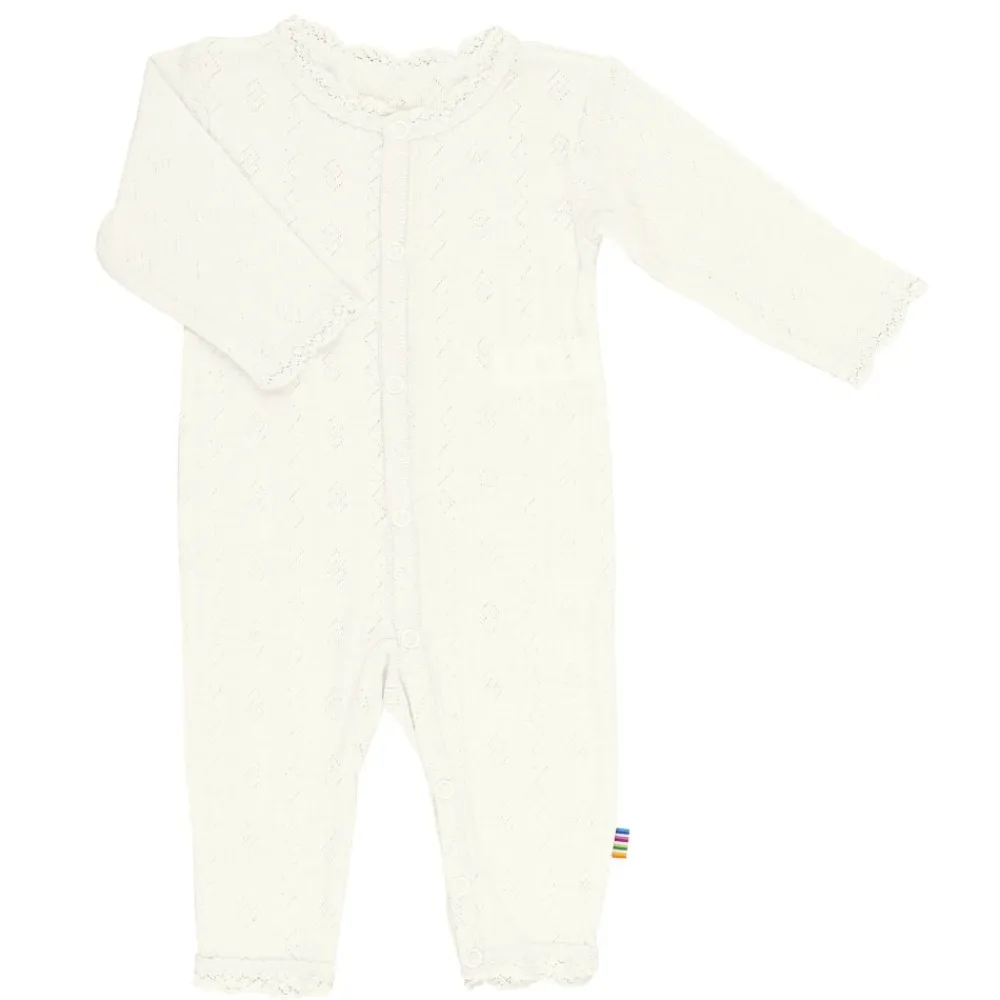 Denne heldrakten er perfekt for å holde barnet varm og komfortabelt på kjølige dager. Blonder og hullmønster gir en ekstra touch av søthet til designet. Ull og silke er naturlige materialer som er skånsomme mot barnets sensitive hud. Ullens regulerende egenskaper gjør at den varmer når det er kaldt og svaler når det er varmt. Fin å bruke hele året.