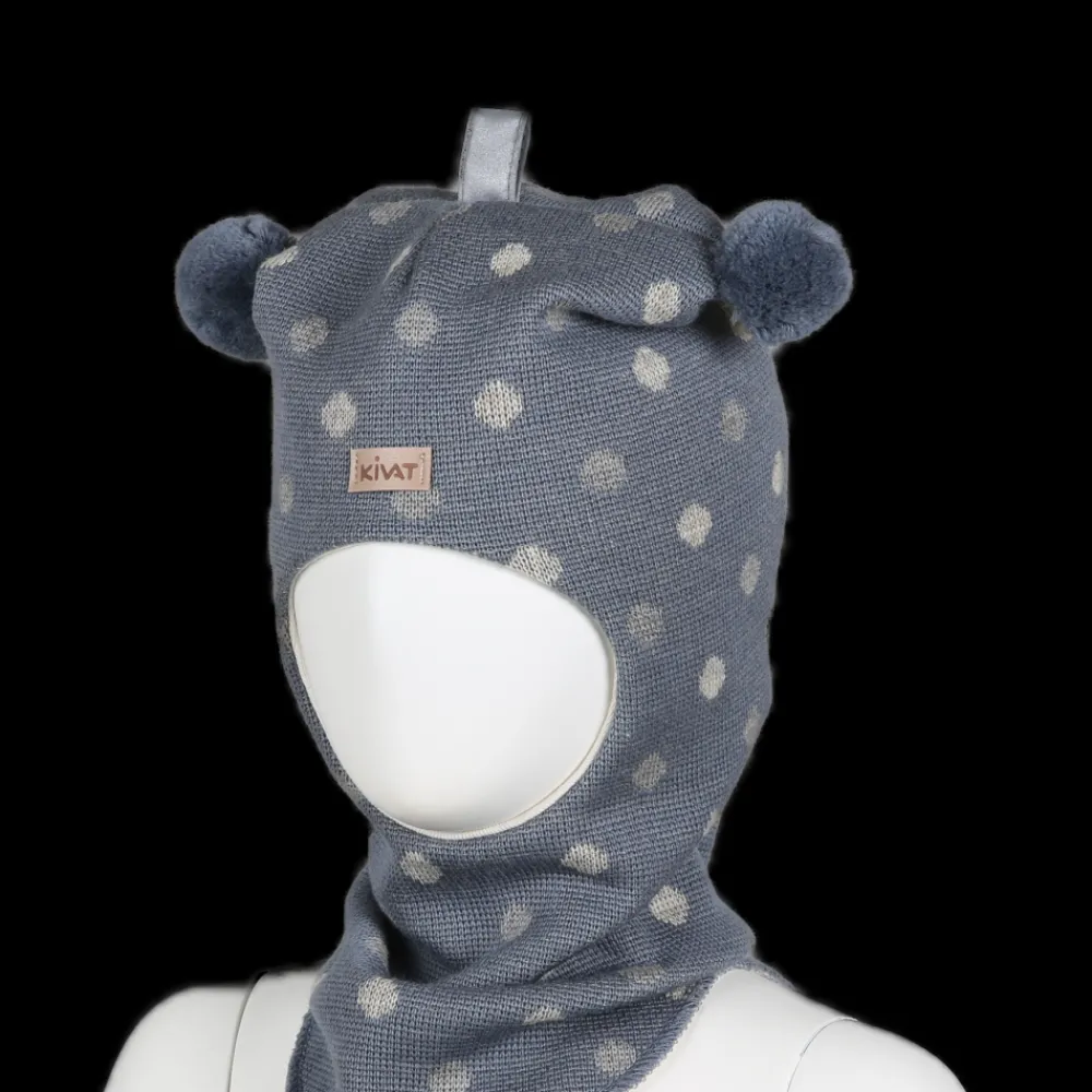Søt og funksjonell balaclava fra Kivat, laget i myk merinoull og foret med økologisk bomull for ekstra komfort. Den har lekent prikkemønster, søte dusker og en diskret Kivat-logo i pannen. Luen sitter godt på hodet og gir optimal beskyttelse for hode, ører og hals gjennom kalde vinterdager.